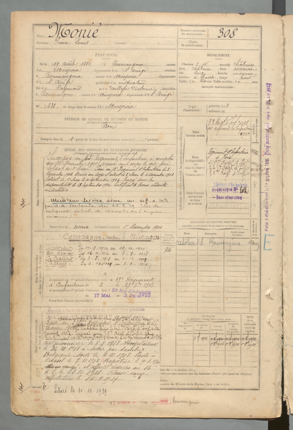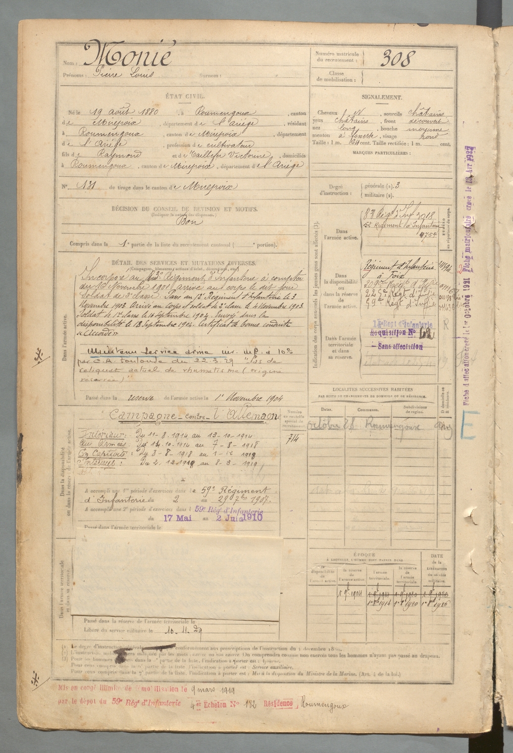 | Monié | Pierre Louis | FOIX | 129 W 2 | 1900 | Roumengoux | Roumengoux | 308 |