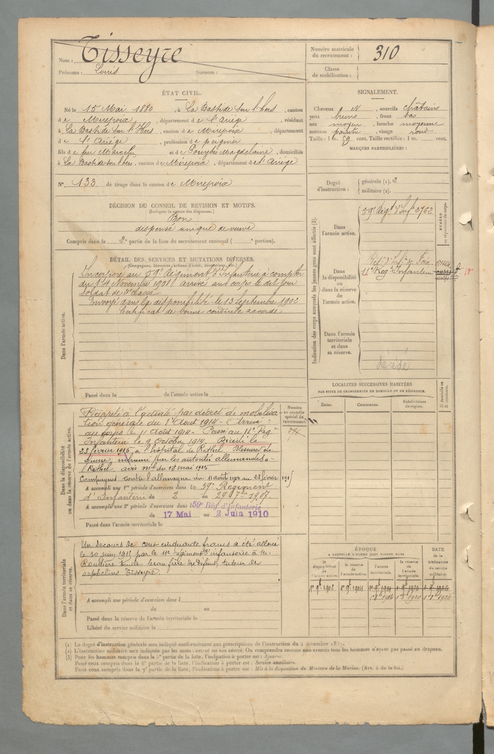 | Tisseyre | Louis | FOIX | 129 W 2 | 1900 | Bastide-sur-l'Hers (La) | Bastide-sur-l'Hers (La) | 310 |