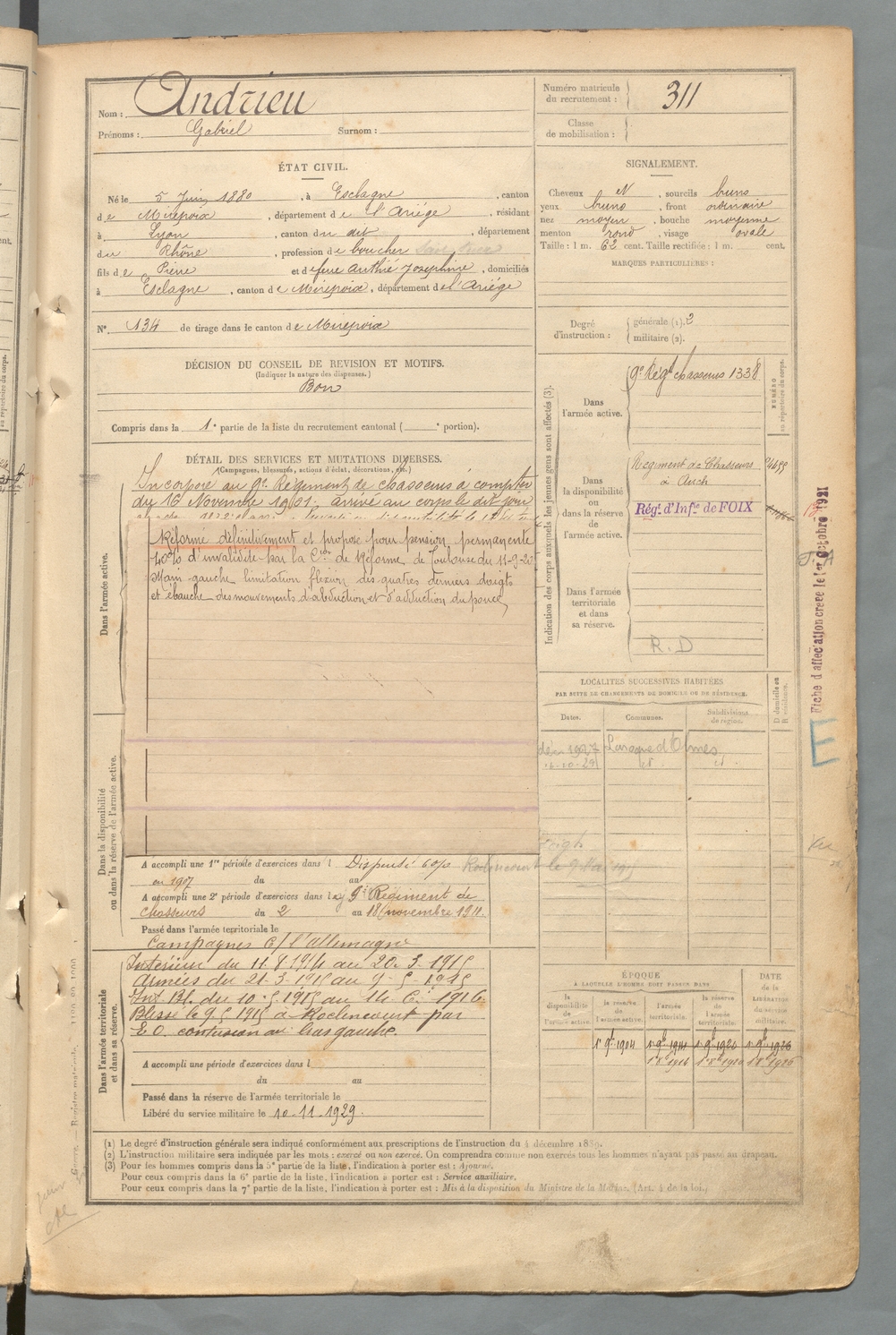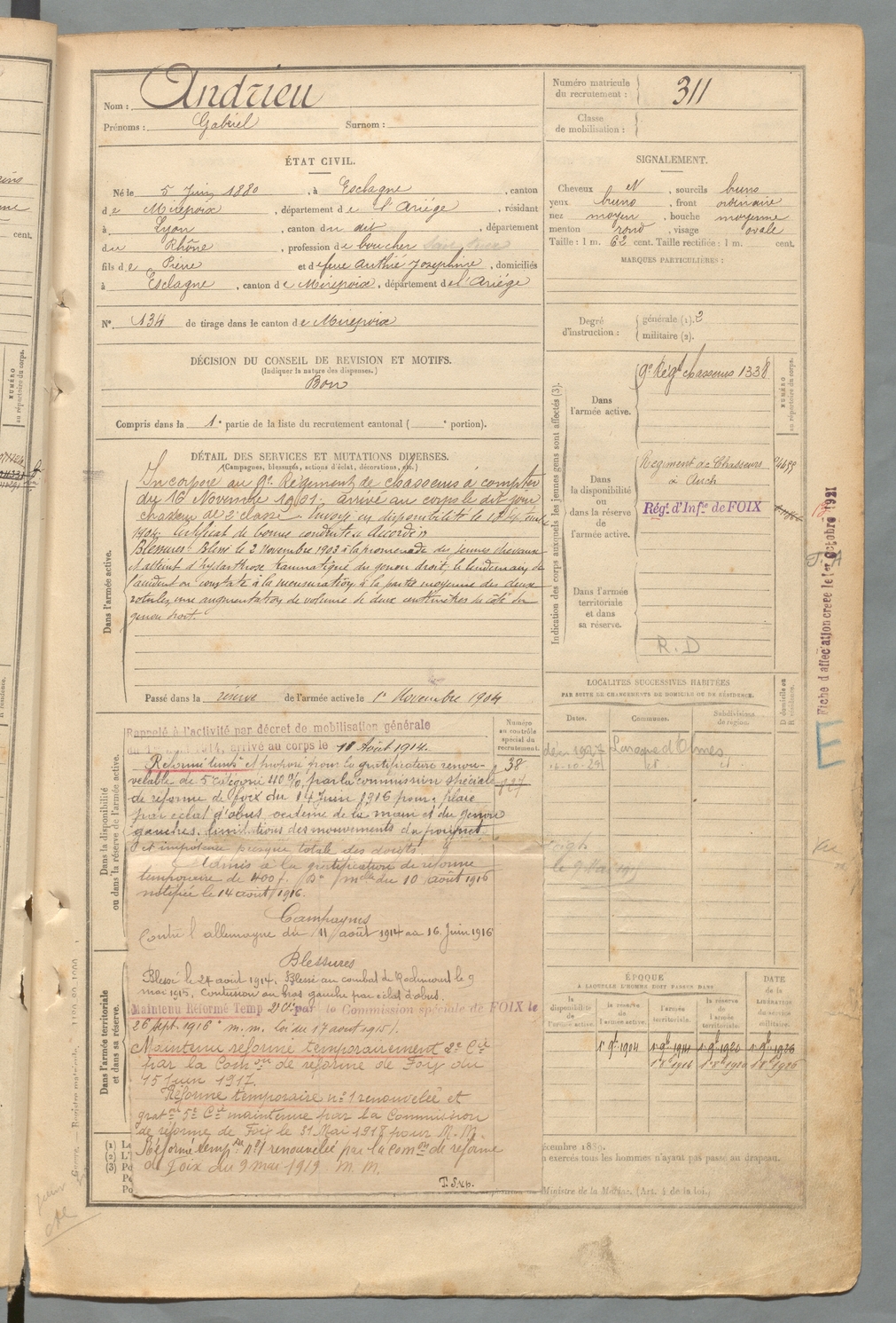 | Andrieu | Gabriel | FOIX | 129 W 2 | 1900 | Esclagne | Lyon | 311 |