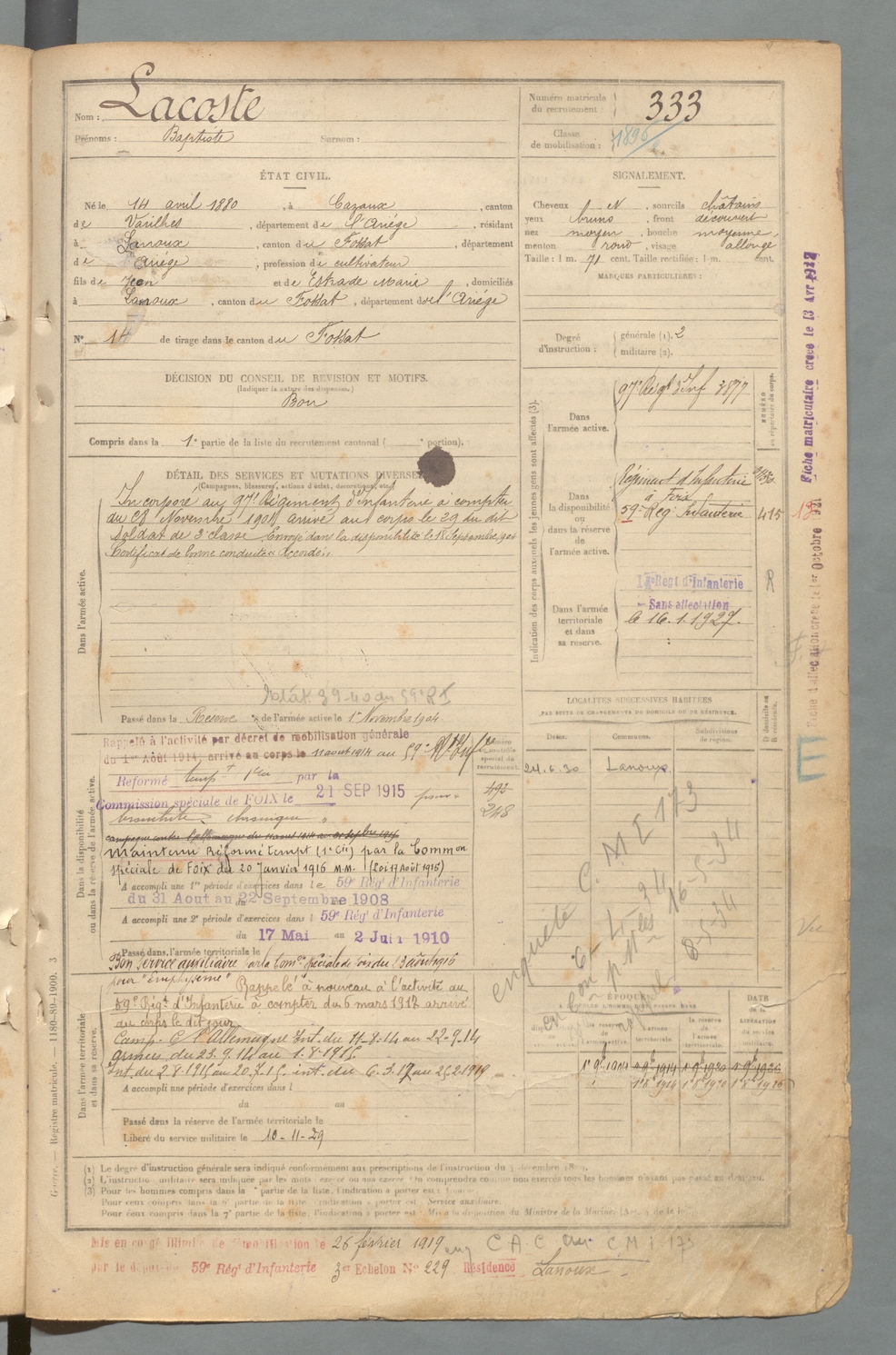 | Lacoste | Baptiste | FOIX | 129 W 2 | 1900 | Cazaux | Lanoux | 333 |