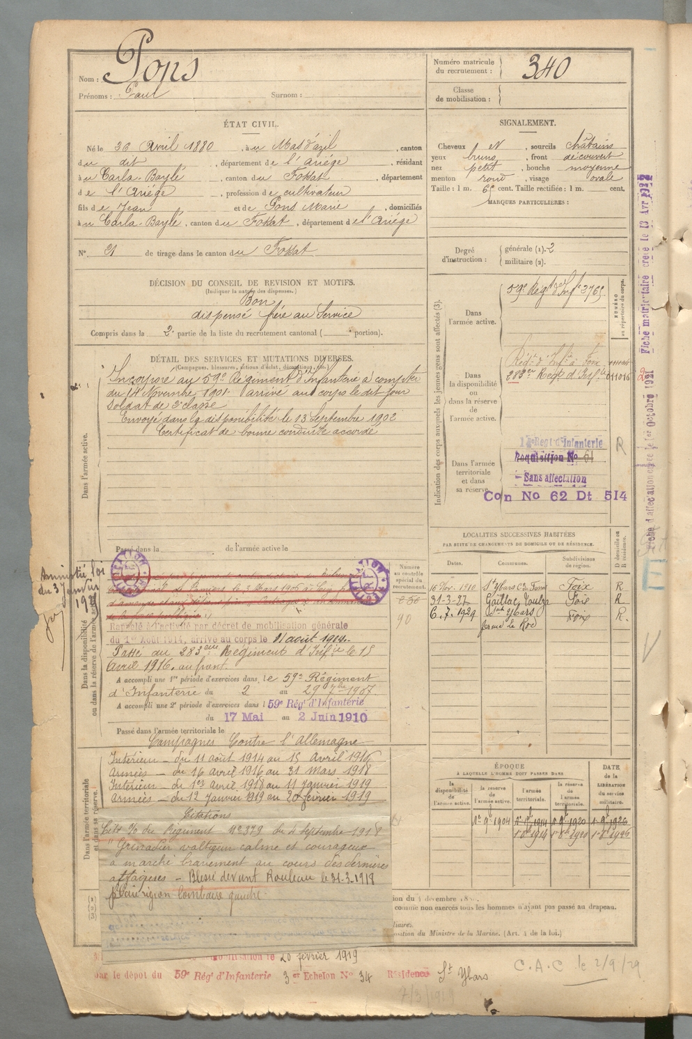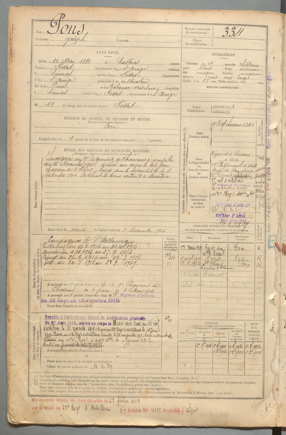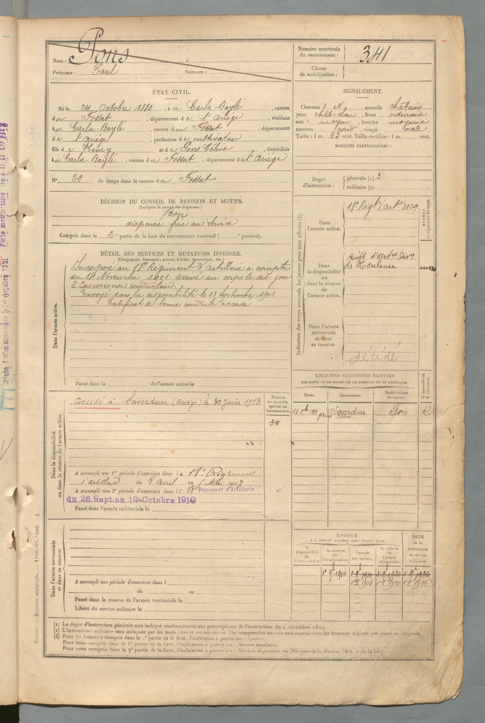 | Pons | Joseph | FOIX | 129 W 2 | 1900 | Castéras | Sieuras | 334 |