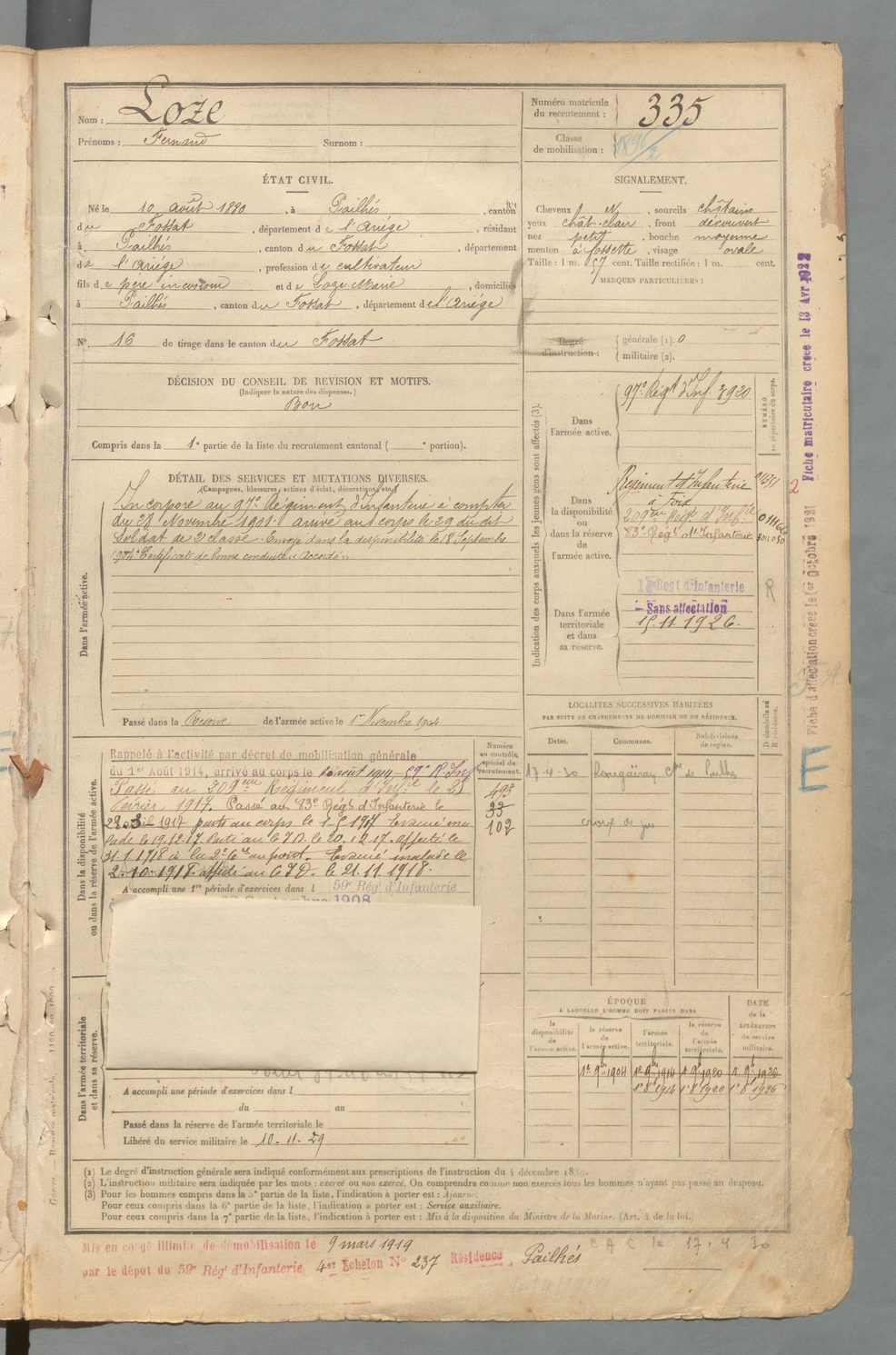 | Loze | Fernand | FOIX | 129 W 2 | 1900 | Pailhès | Pailhès | 335 |