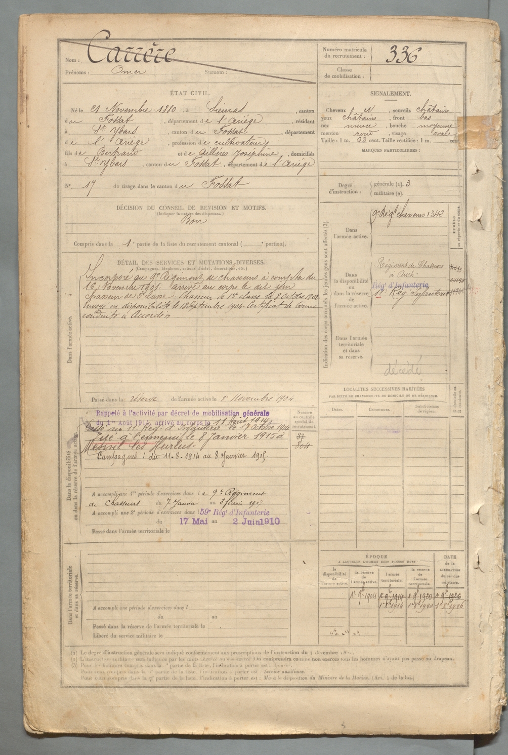 | Carrère | Omer | FOIX | 129 W 2 | 1900 | Sieuras | Saint-Ybars | 336 |