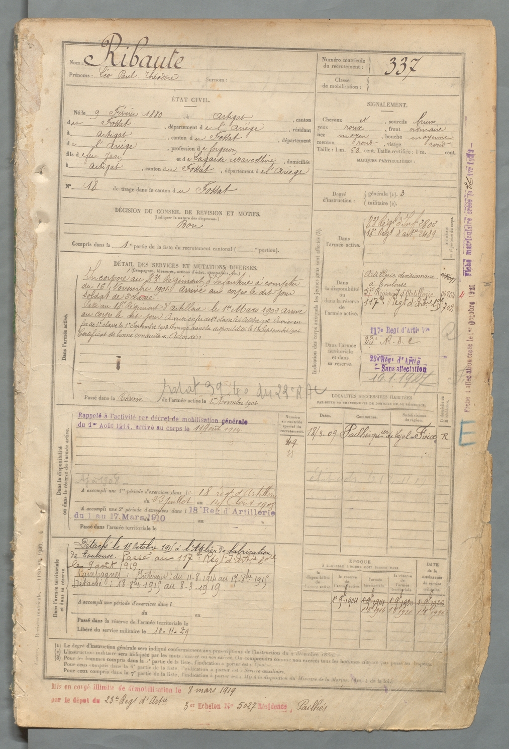 | Ribaute | Léo Paul Théodore | FOIX | 129 W 2 | 1900 | Artigat | Artigat | 337 |