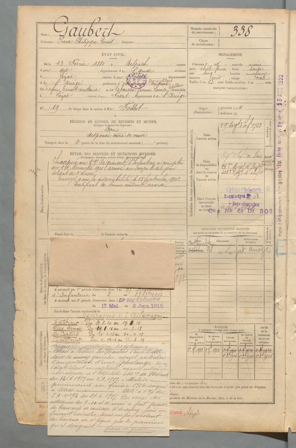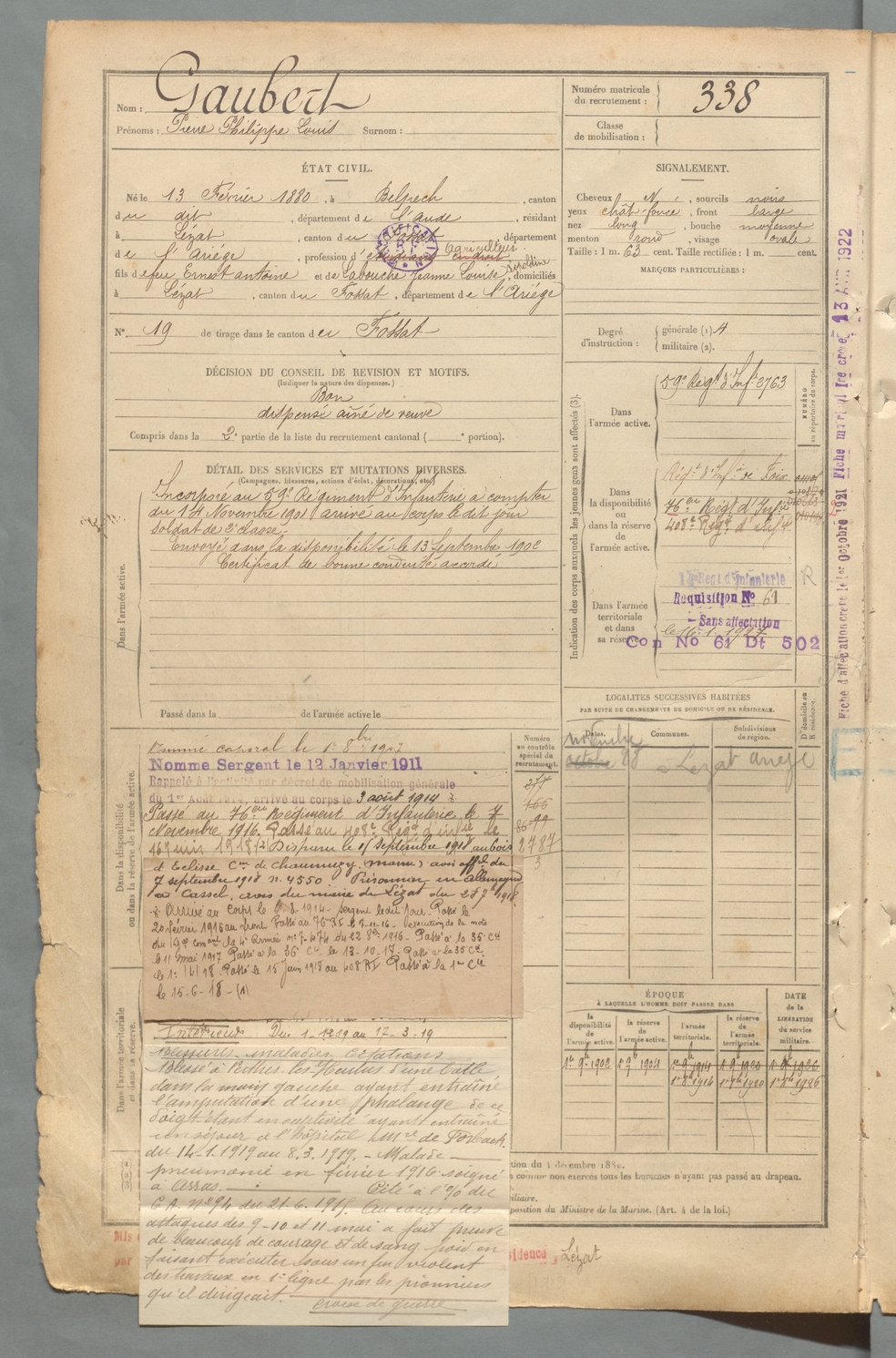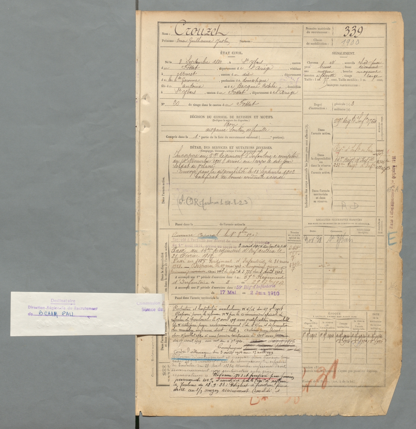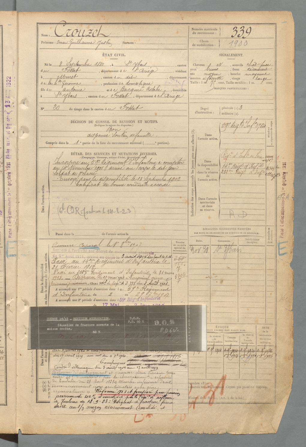 | Crouzet | Omer Guilhaume Justin | FOIX | 129 W 2 | 1900 | Saint-Ybars | Muret | 339 |