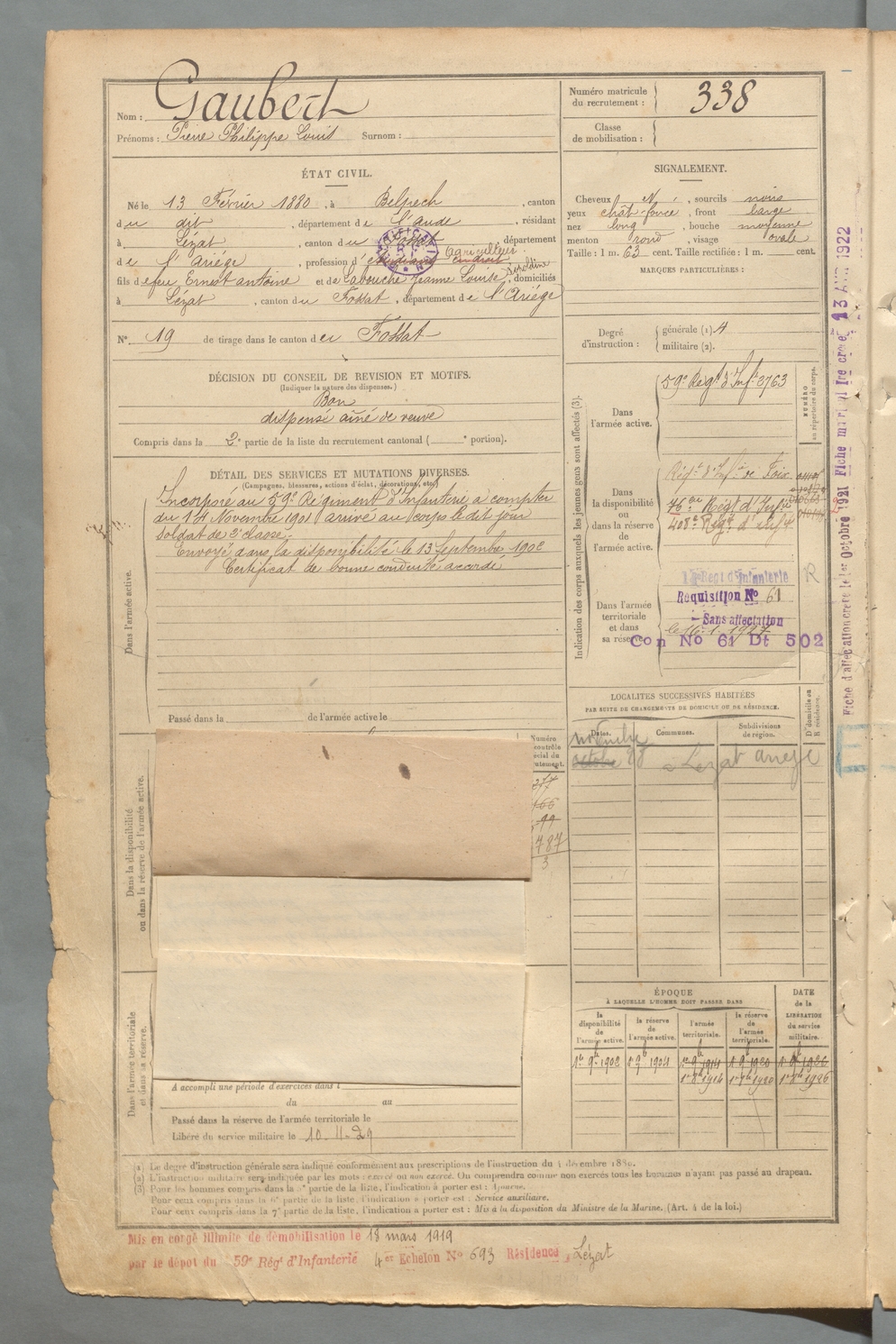 | Gaubert | Pierre Philippe Louis | FOIX | 129 W 2 | 1900 | Belpech | Lézat-sur-Lèze | 338 |
