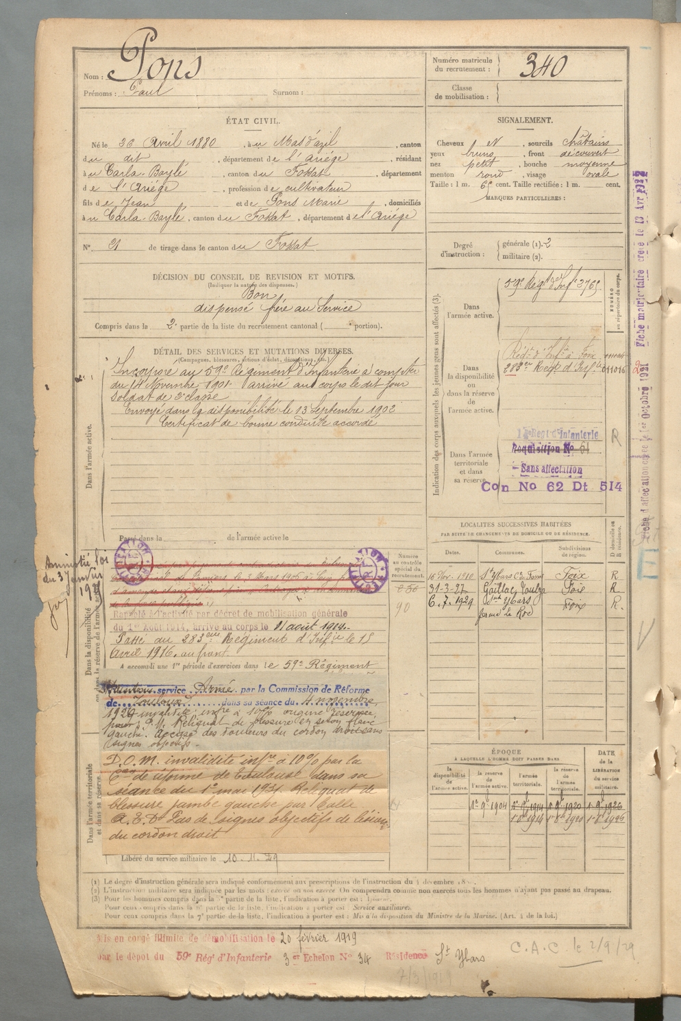 | Pons | Paul | FOIX | 129 W 2 | 1900 | Mas-d'Azil (Le) | Carla-Bayle (Le) | 340 |