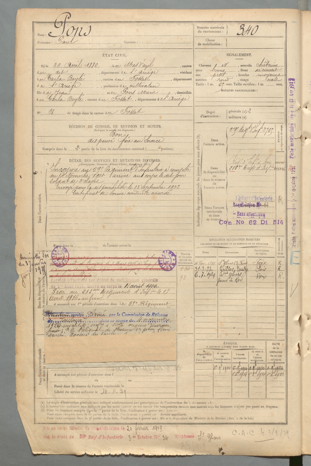 | Pons | Paul | FOIX | 129 W 2 | 1900 | Carla-Bayle (Le) | Carla-Bayle (Le) | 341 |