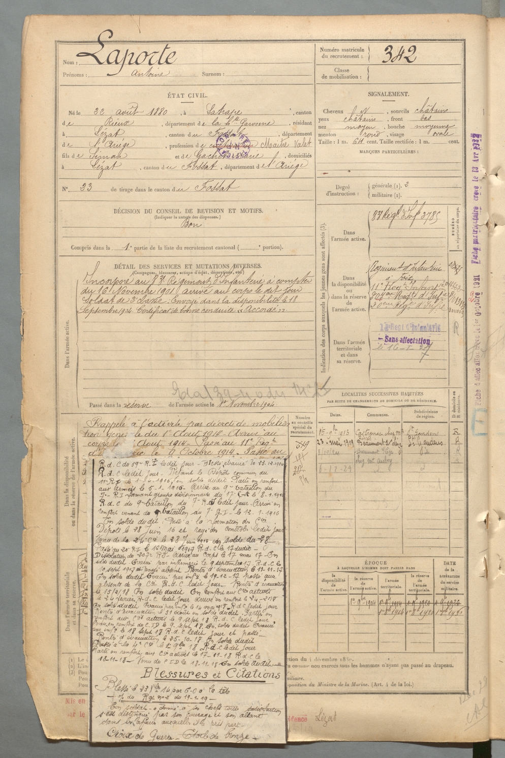 | Laporte | Antoine | FOIX | 129 W 2 | 1900 | Latrape | Lézat-sur-Lèze | 342 |