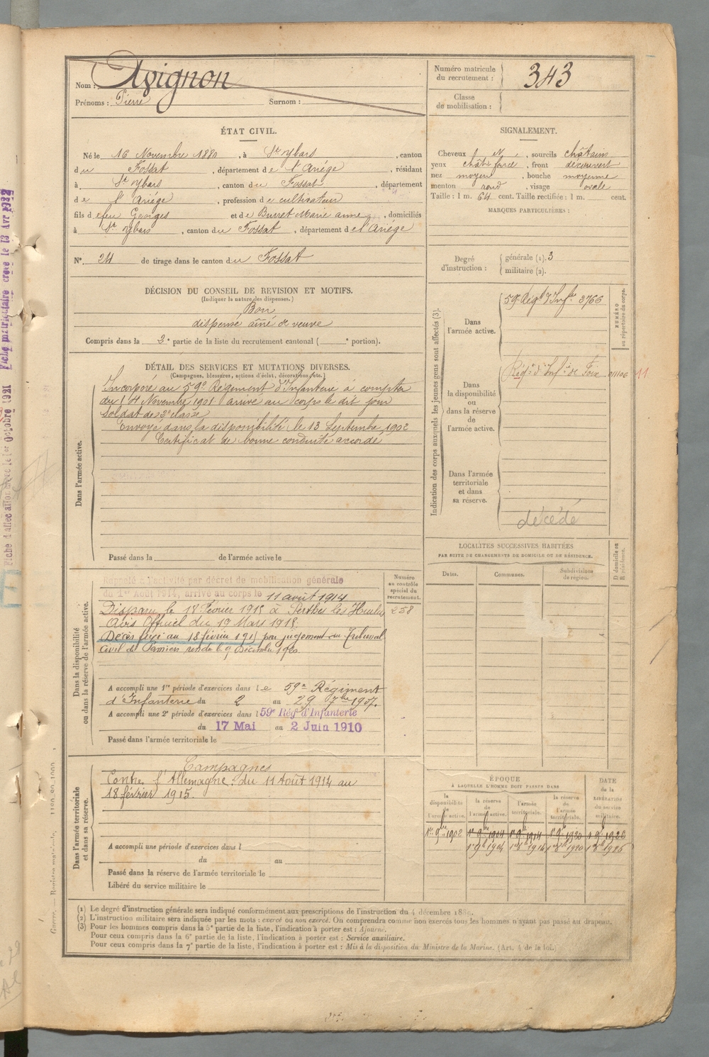 | Avignon | Pierre | FOIX | 129 W 2 | 1900 | Saint-Ybars | Saint-Ybars | 343 |