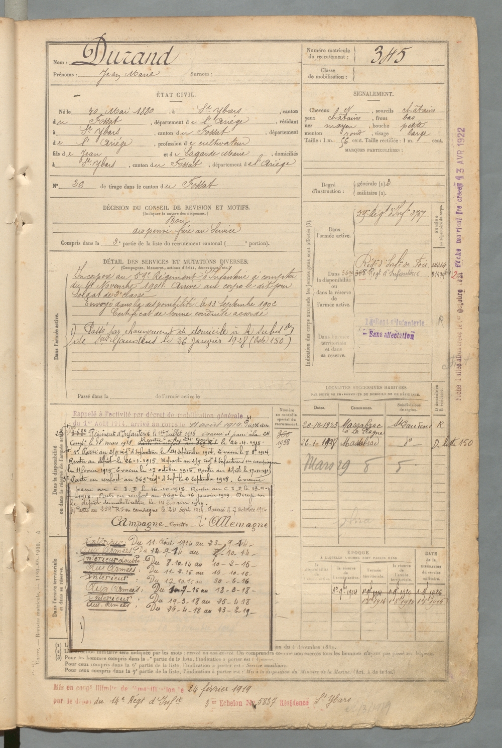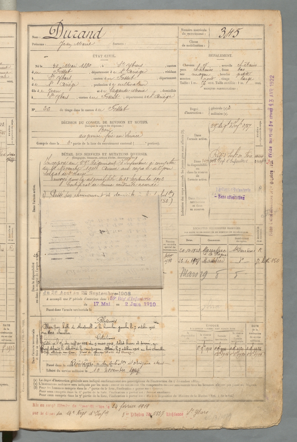 | Durand | Jean Marie | FOIX | 129 W 2 | 1900 | Saint-Ybars | Saint-Ybars | 345 |
