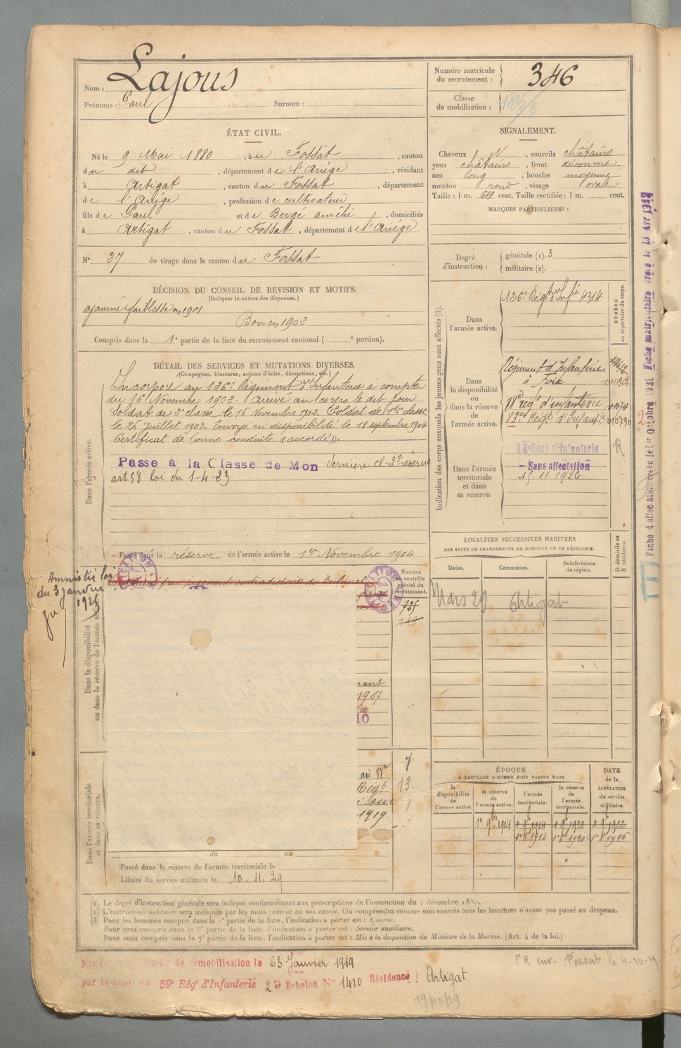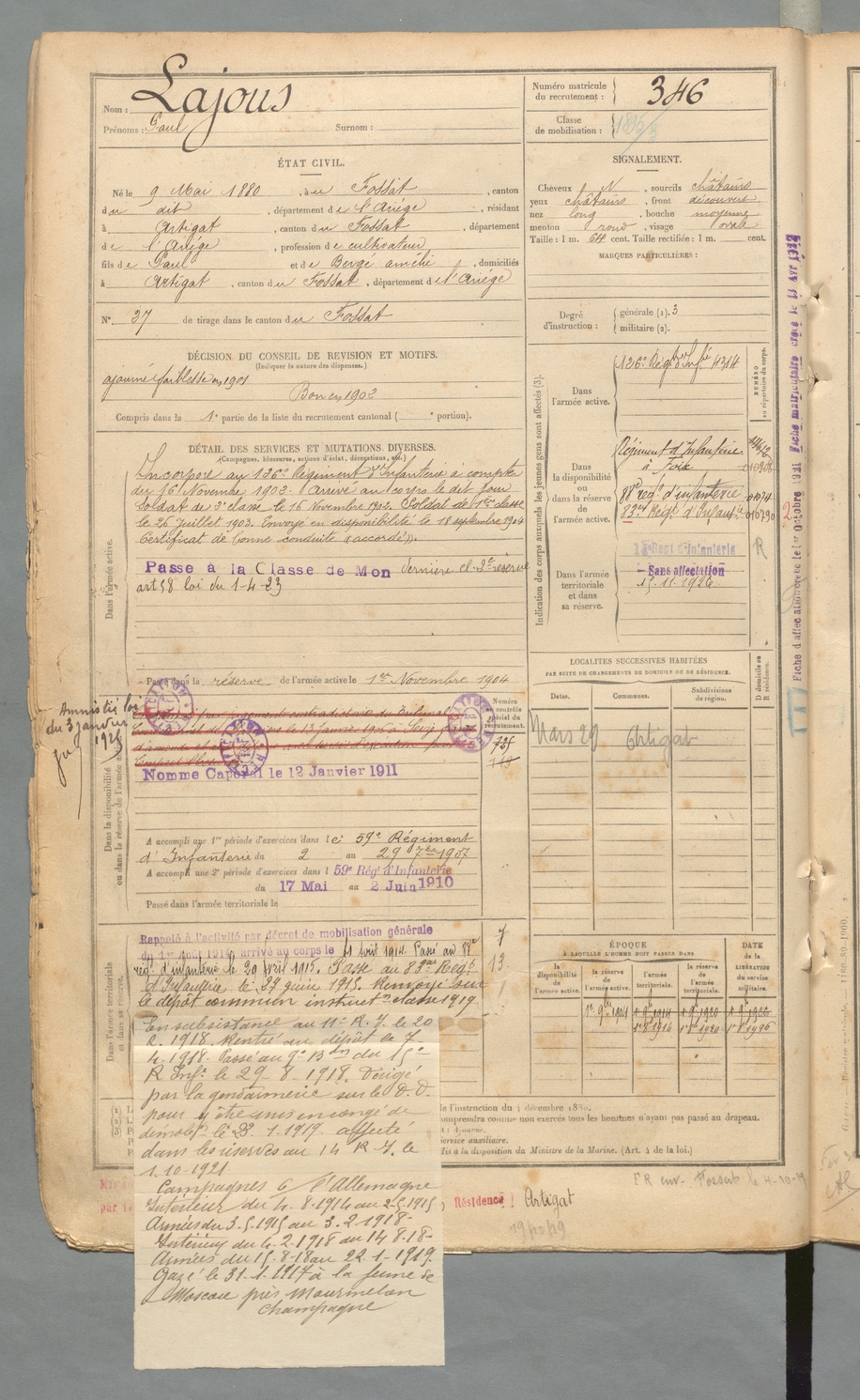 | Lajous | Paul | FOIX | 129 W 2 | 1900 | Fossat (Le) | Artigat | 346 |