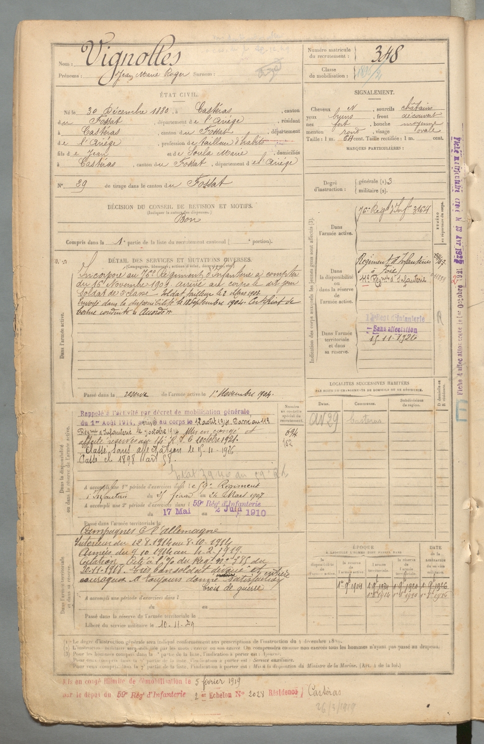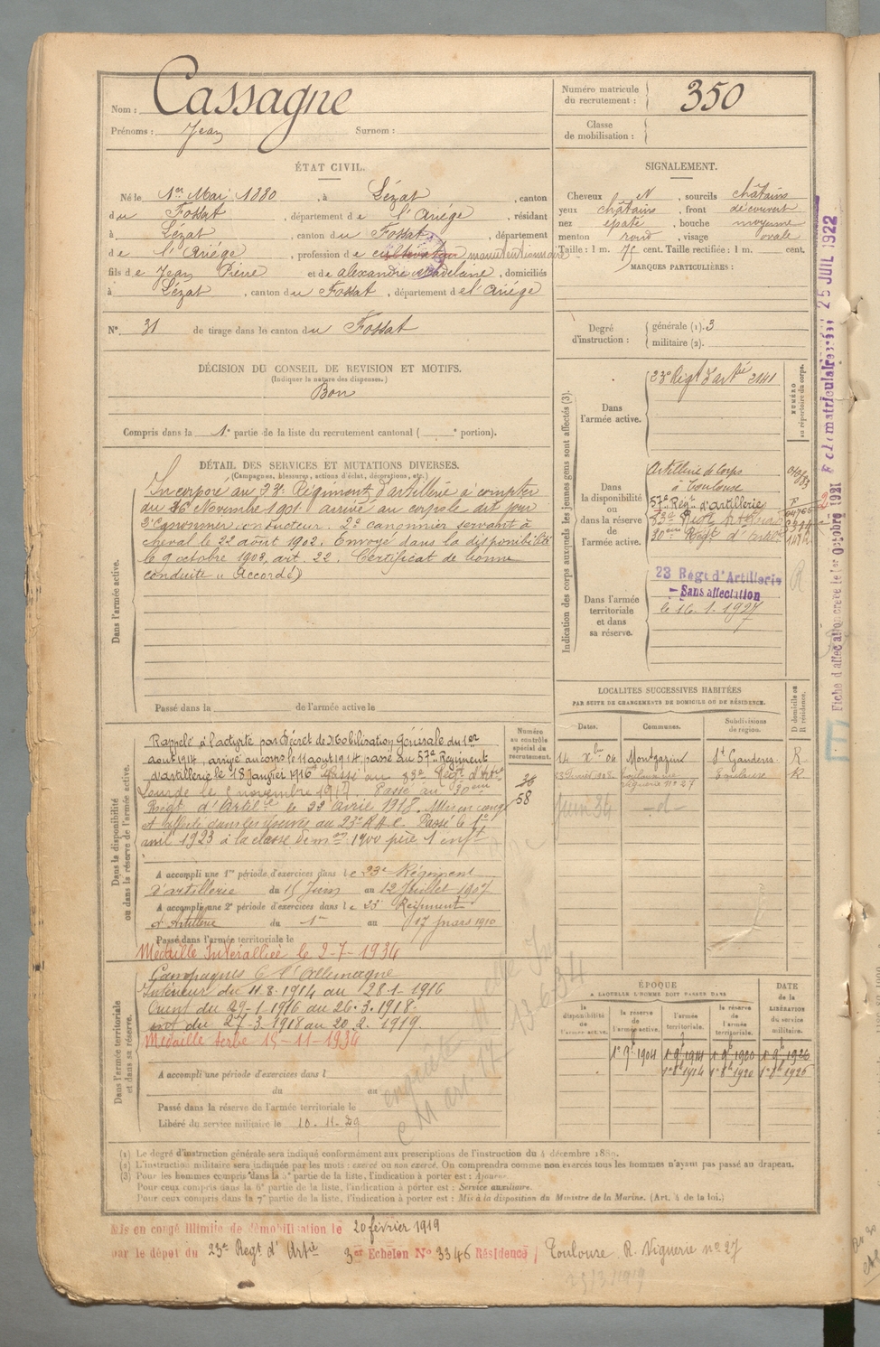 | Cassagne | Jean | FOIX | 129 W 2 | 1900 | Lézat-sur-Lèze | Lézat-sur-Lèze | 350 |