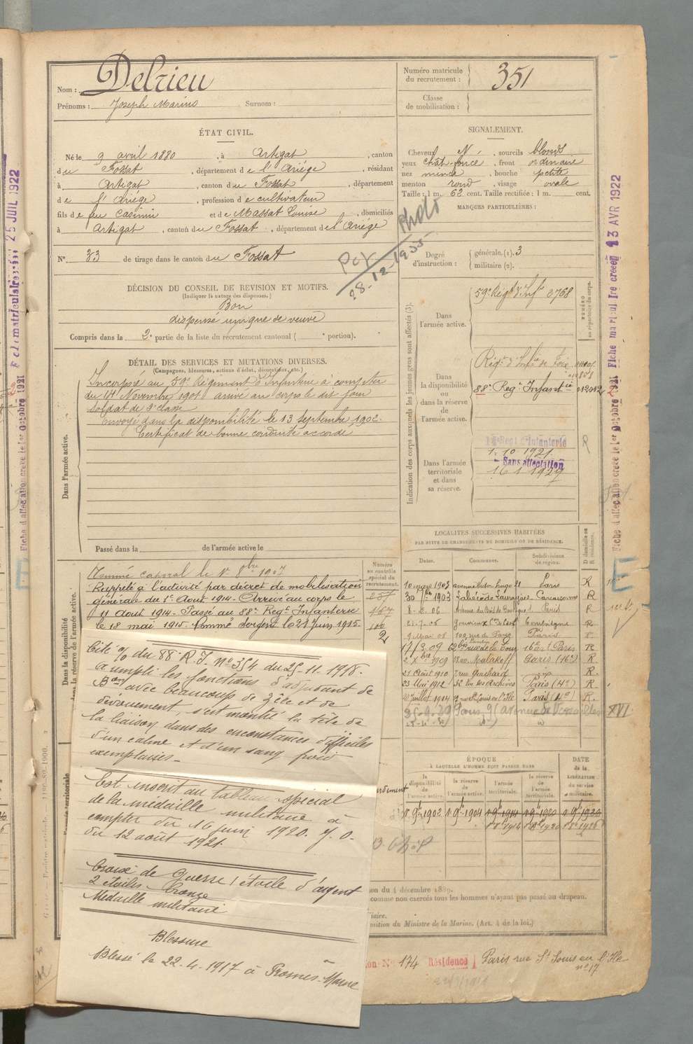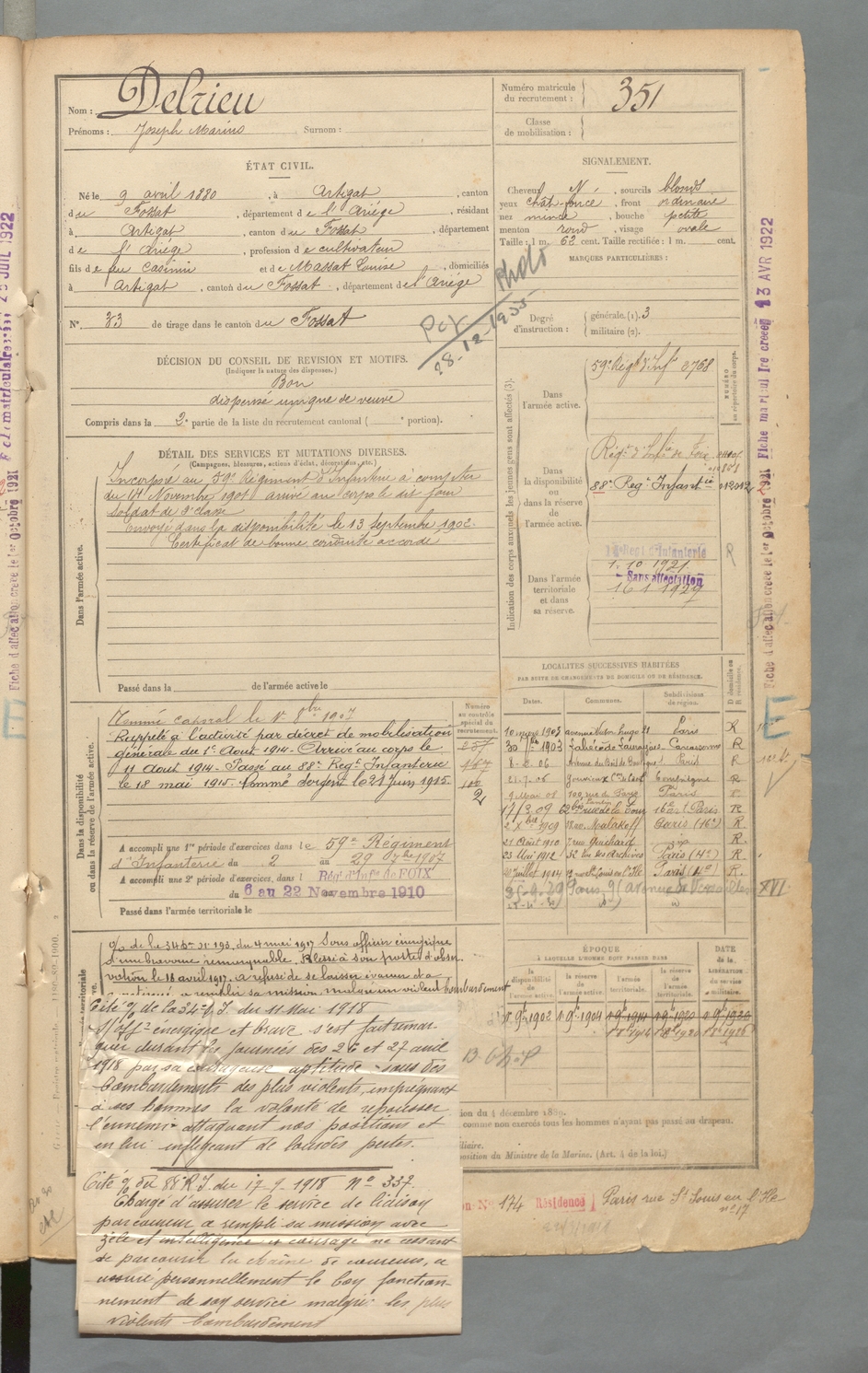 | Delrieu | Joseph Marius | FOIX | 129 W 2 | 1900 | Artigat | Artigat | 351 |