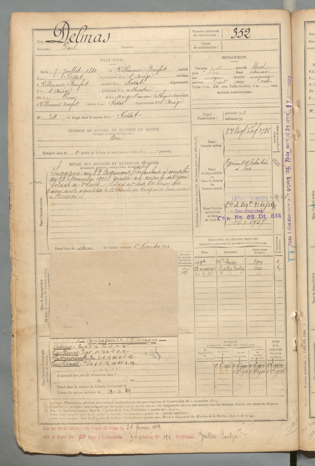 | Delmas | Paul | FOIX | 129 W 2 | 1900 | Durfort | Durfort | 352 |