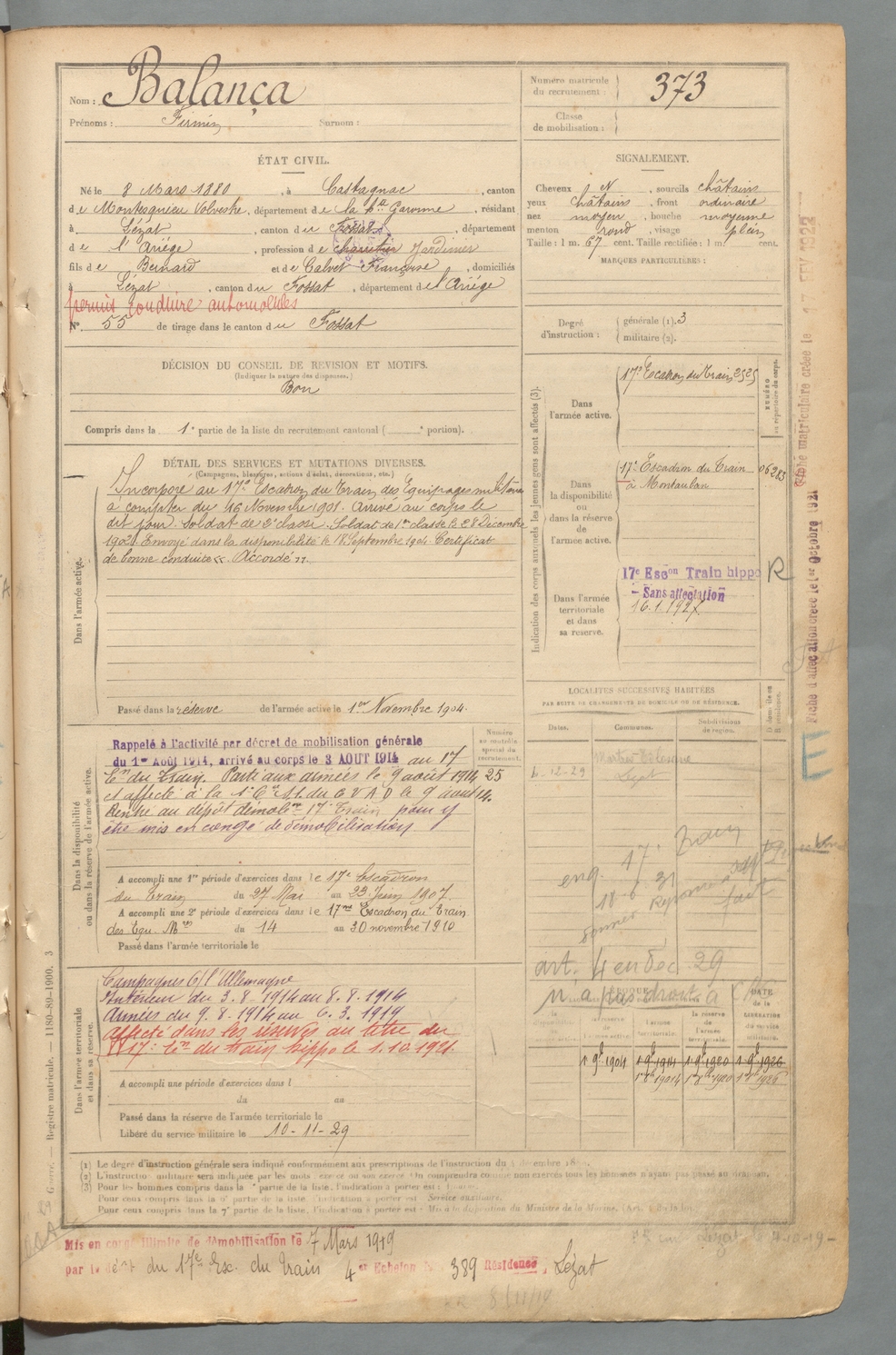 | Balança | Firmin | FOIX | 129 W 2 | 1900 | Castagnac | Lézat-sur-Lèze | 373 |