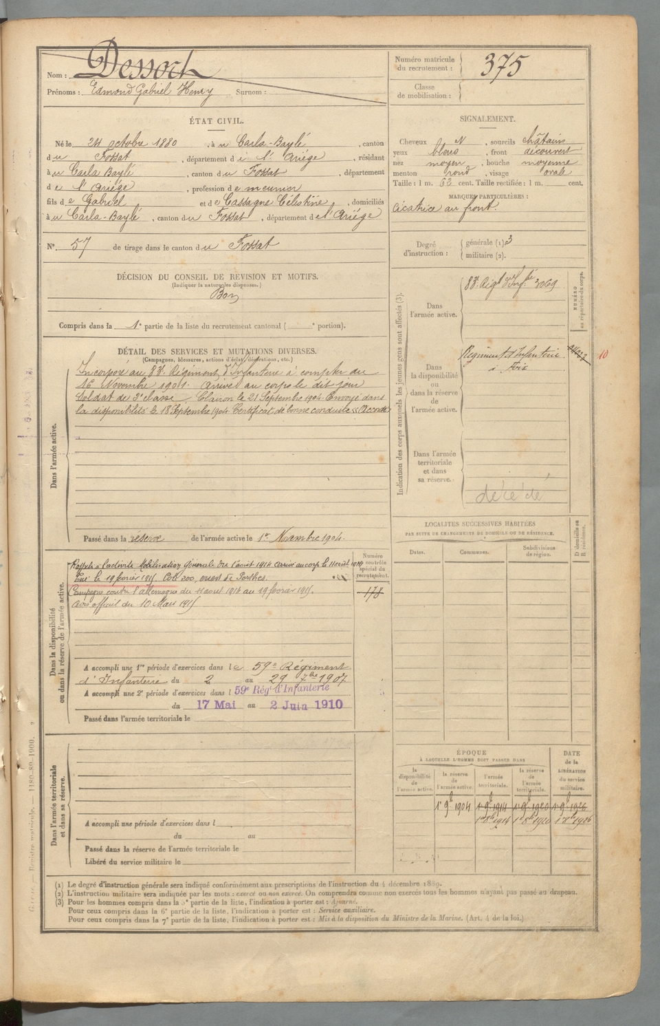 | Dessort | Edmond Gabriel Henry | FOIX | 129 W 2 | 1900 | Carla-Bayle (Le) | Carla-Bayle (Le) | 375 |