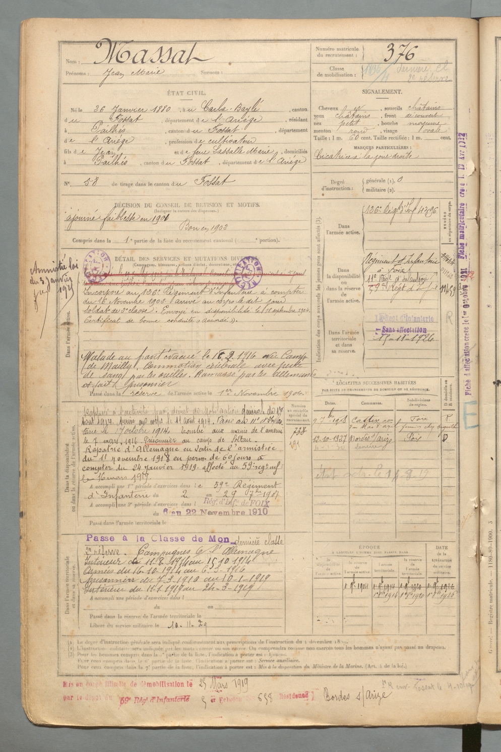 | Massat | Jean Marie | FOIX | 129 W 2 | 1900 | Carla-Bayle (Le) | Pailhès | 376 |