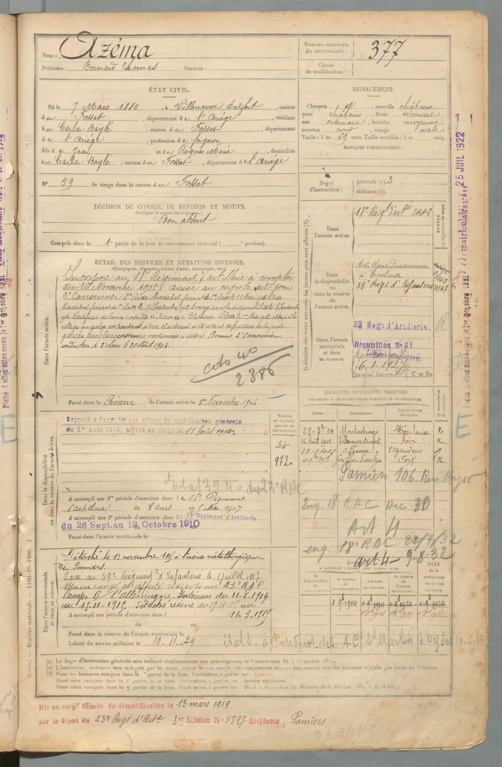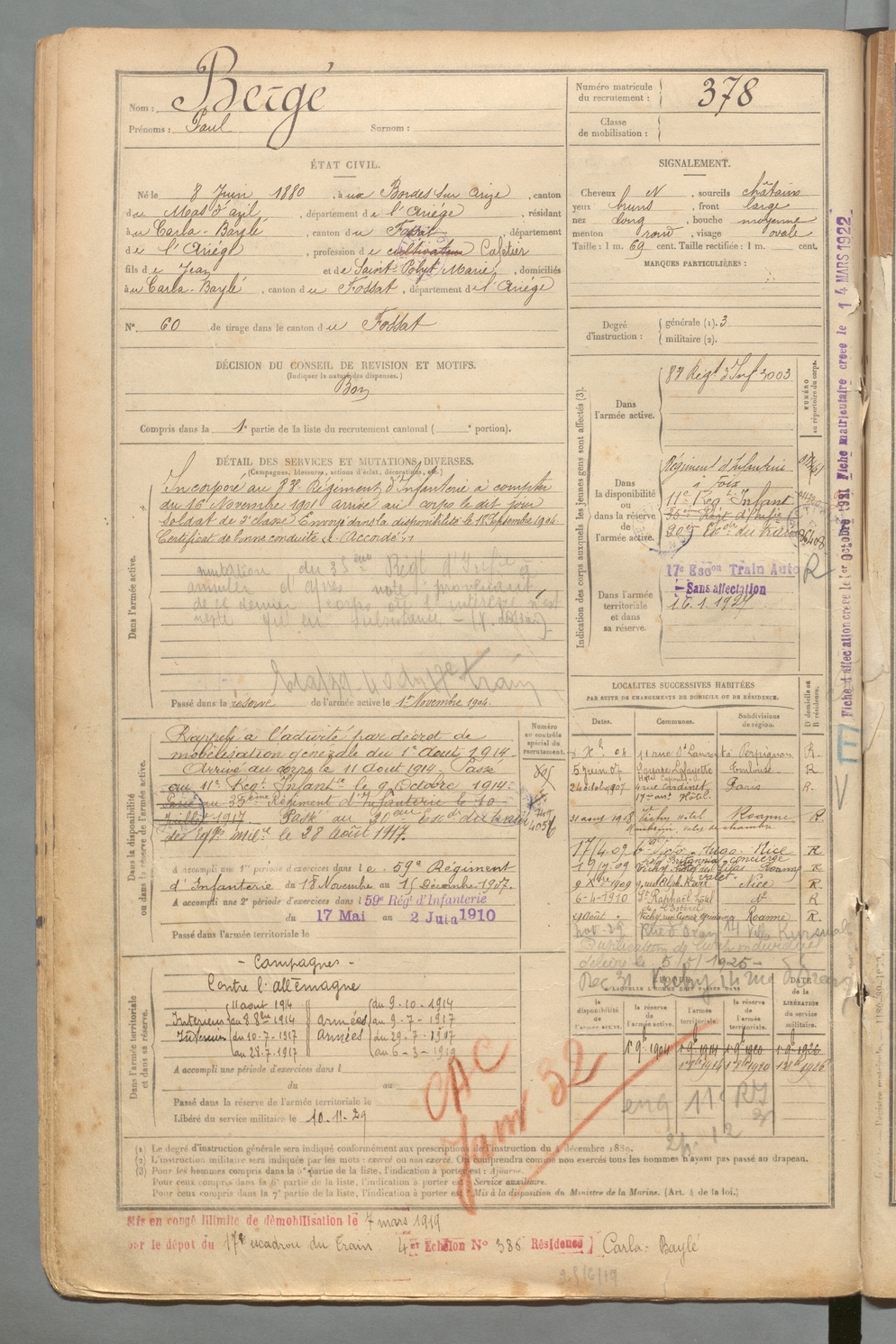 | Bergé | Paul | FOIX | 129 W 2 | 1900 | Bordes-sur-Arize (Les) | Carla-Bayle (Le) | 378 |