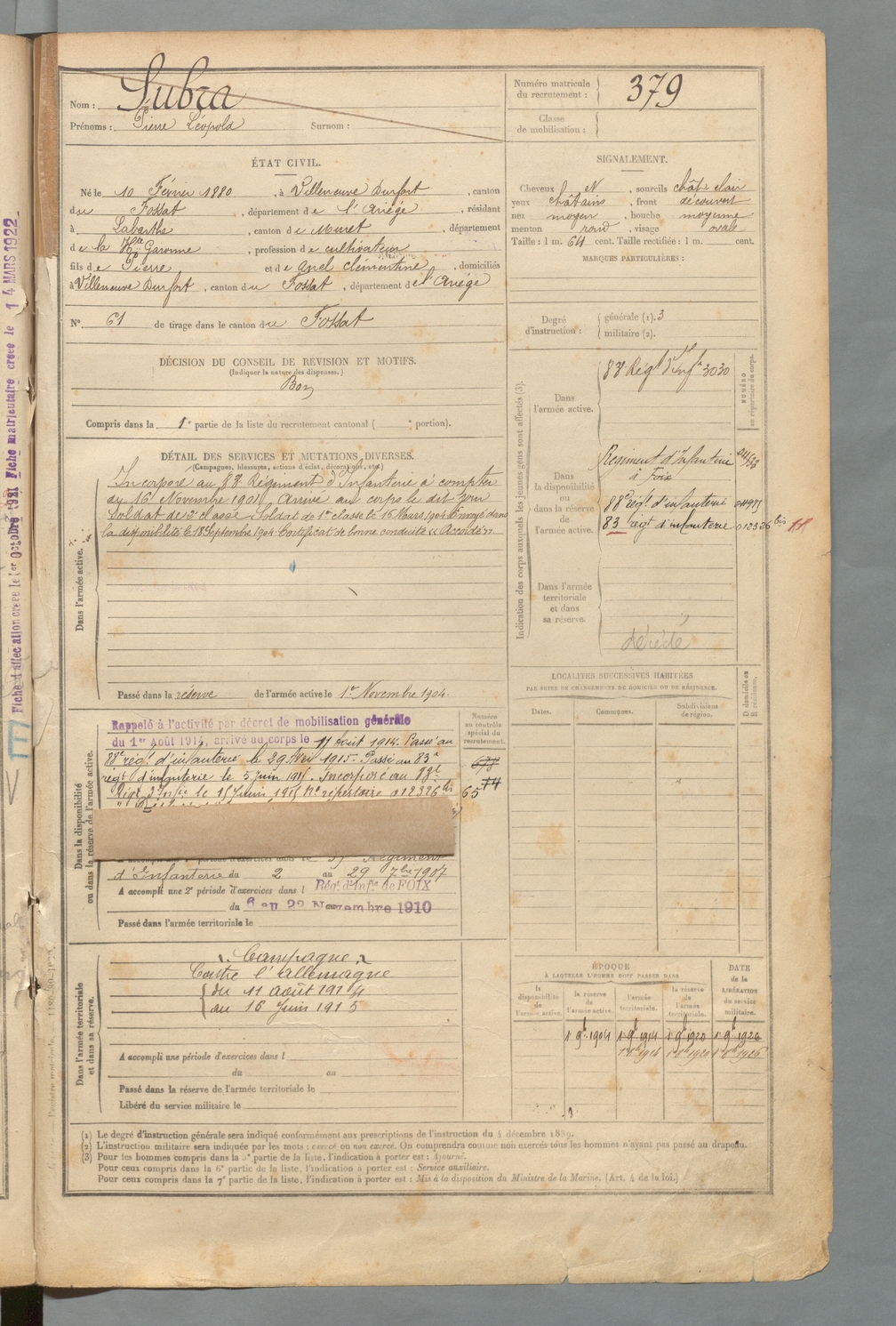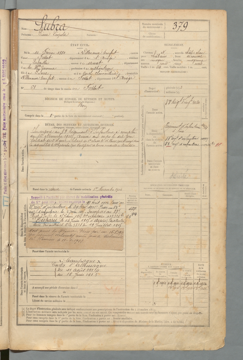 | Subra | Pierre Léopold | FOIX | 129 W 2 | 1900 | Durfort | Labarthe | 379 |
