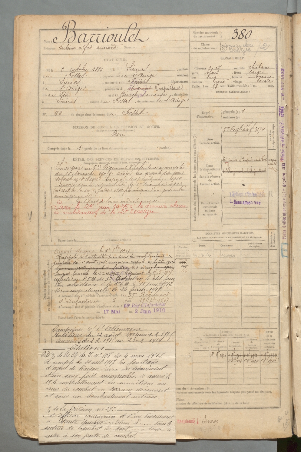 | Barrioulet | Antoine Alfred Armand | FOIX | 129 W 2 | 1900 | Sieuras | Sieuras | 380 |