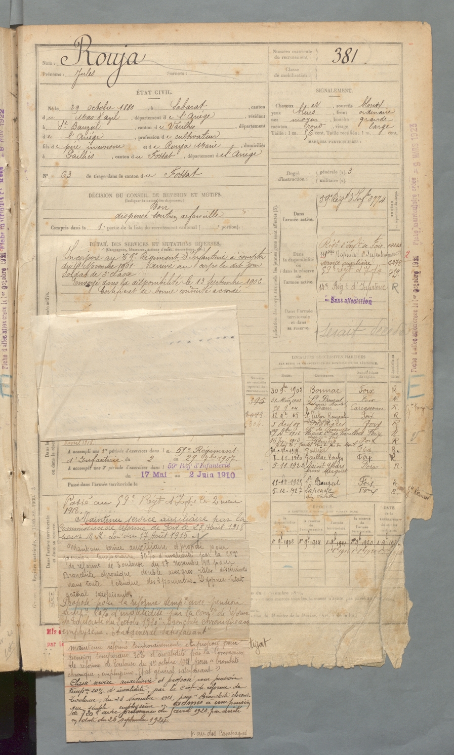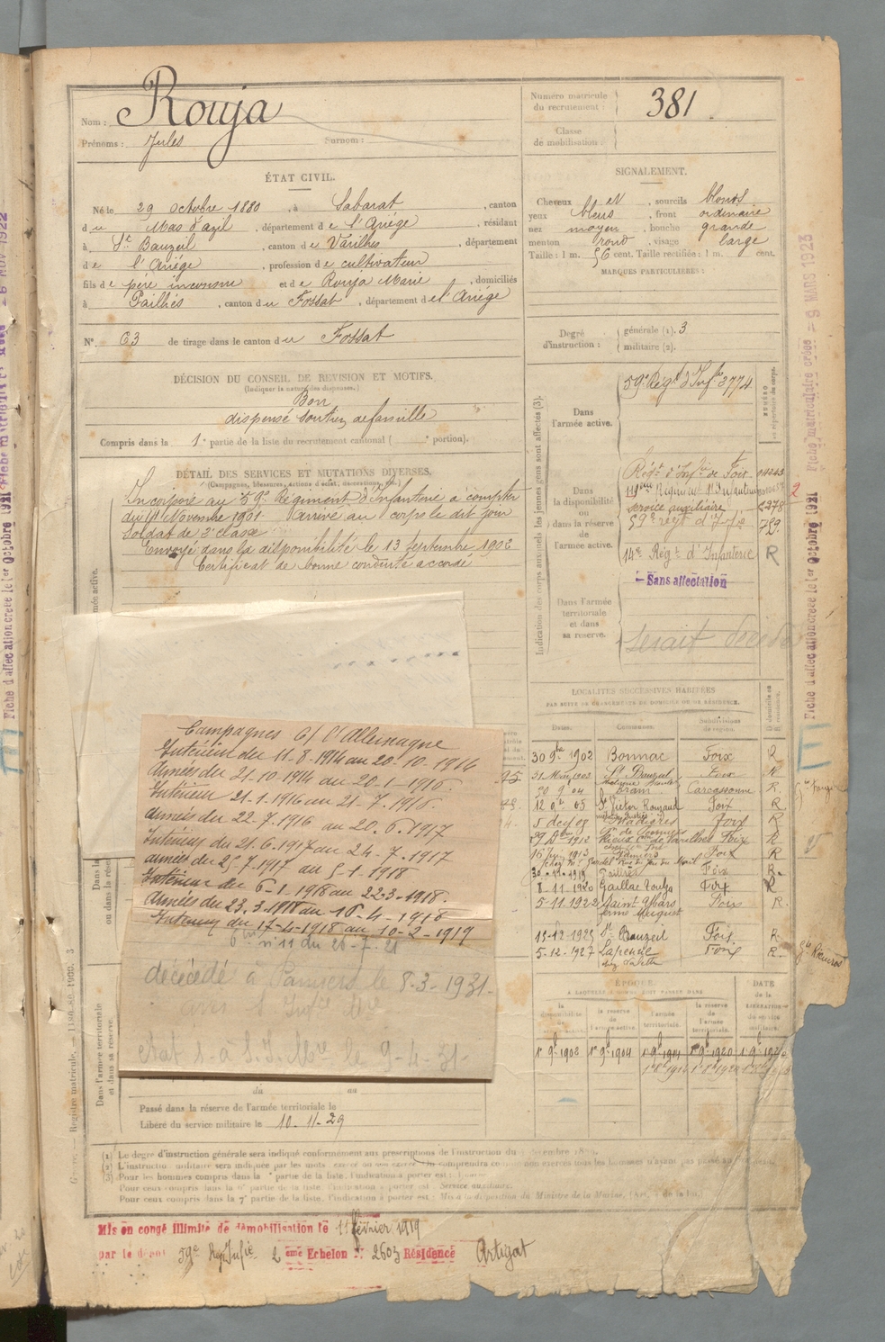 | Rouja | Jules | FOIX | 129 W 2 | 1900 | Sabarat | Saint-Bauzeil | 381 |
