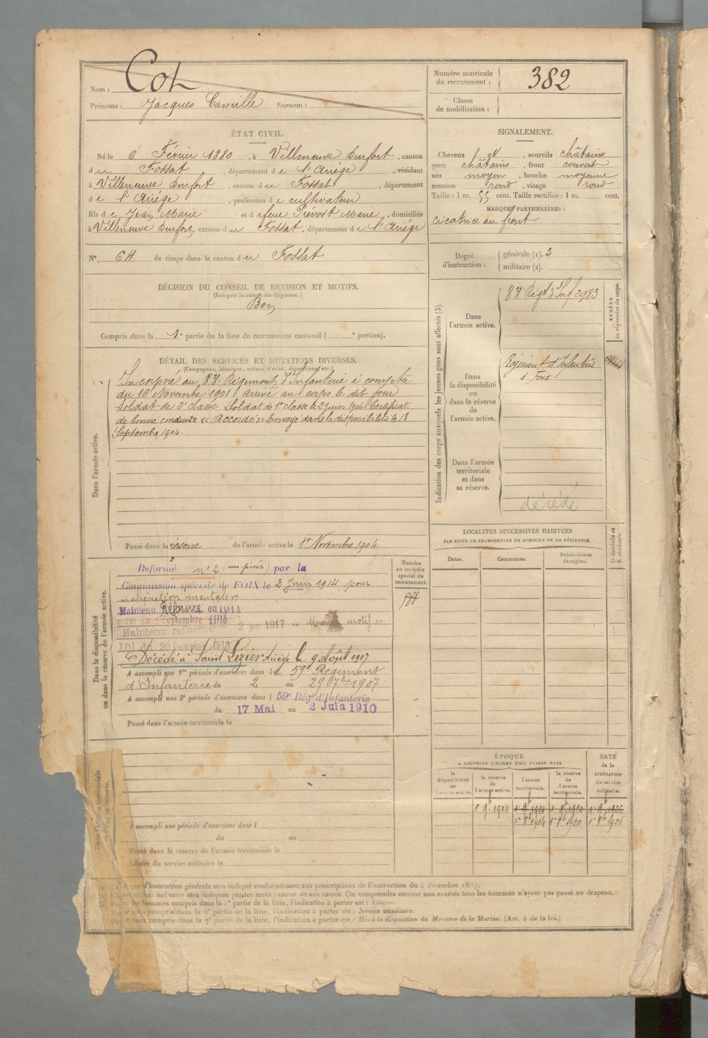 | Cot | Jacques Camille | FOIX | 129 W 2 | 1900 | Durfort | Durfort | 382 |
