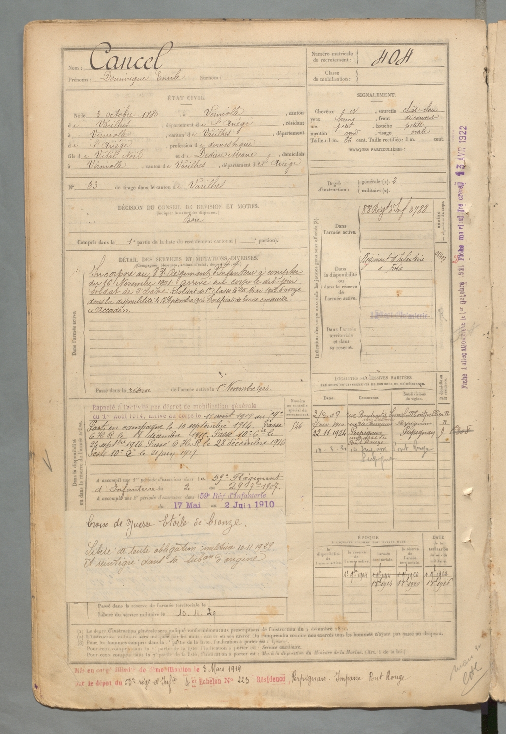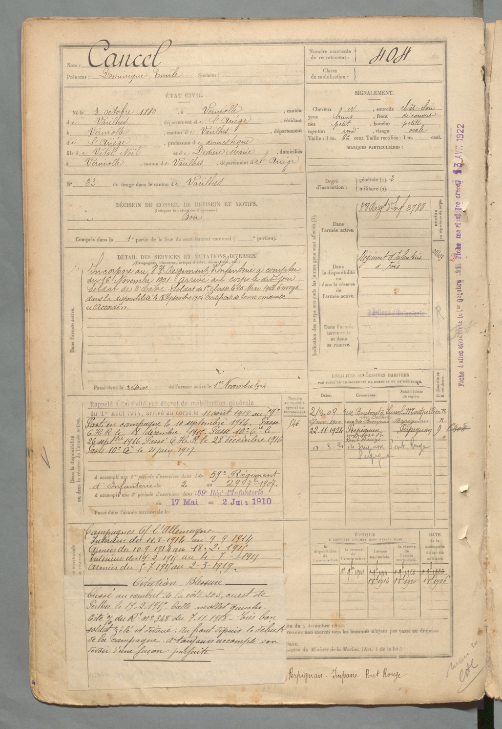 | Cancel | Dominique Emile | FOIX | 129 W 2 | 1900 | Verniolle | Verniolle | 404 |