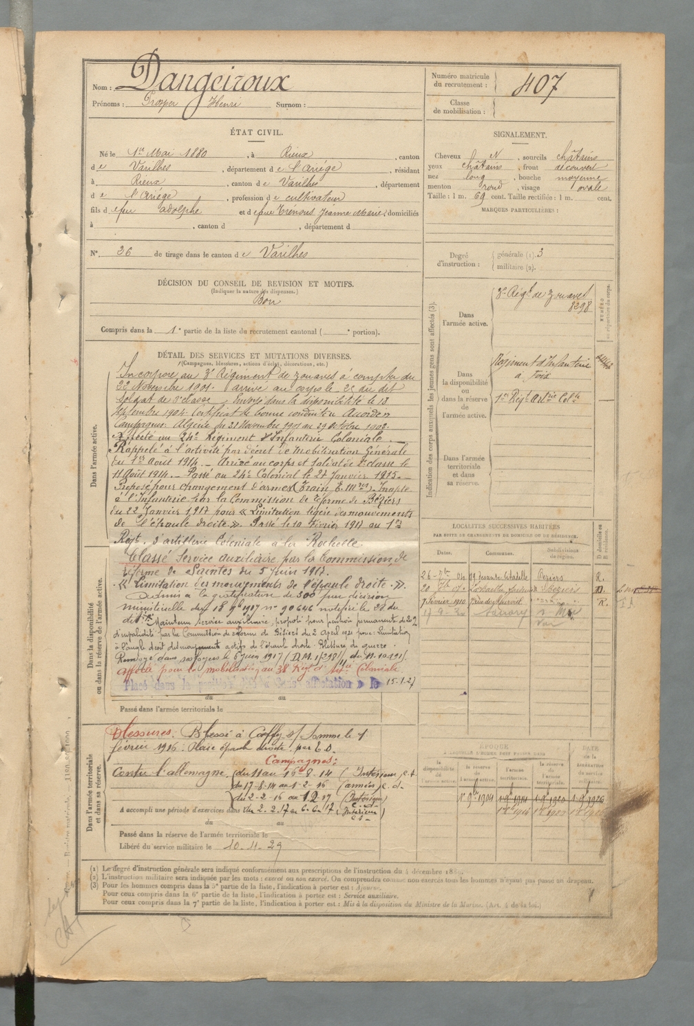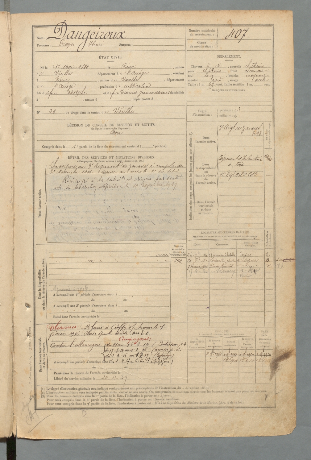 | Dangeiroux | Prosper Henri | FOIX | 129 W 2 | 1900 | Rieux-de-Pelleport | Rieux-de-Pelleport | 407 |