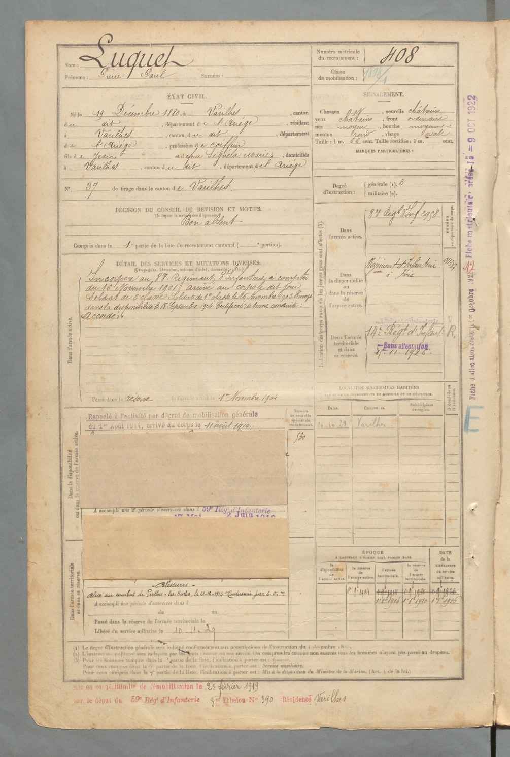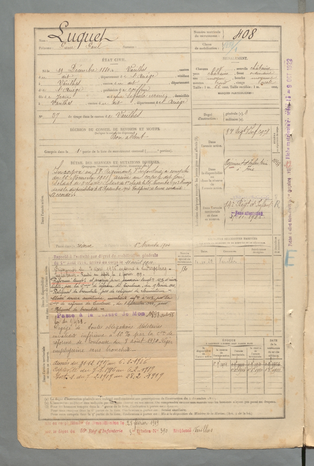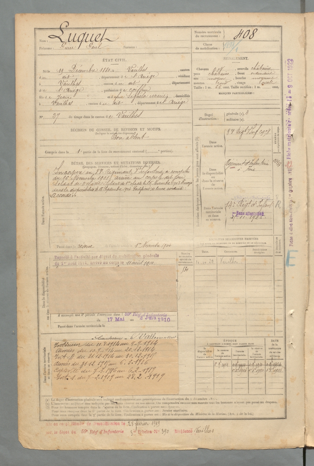 | Luquet | Pierre Paul | FOIX | 129 W 2 | 1900 | Varilhes | Varilhes | 408 |