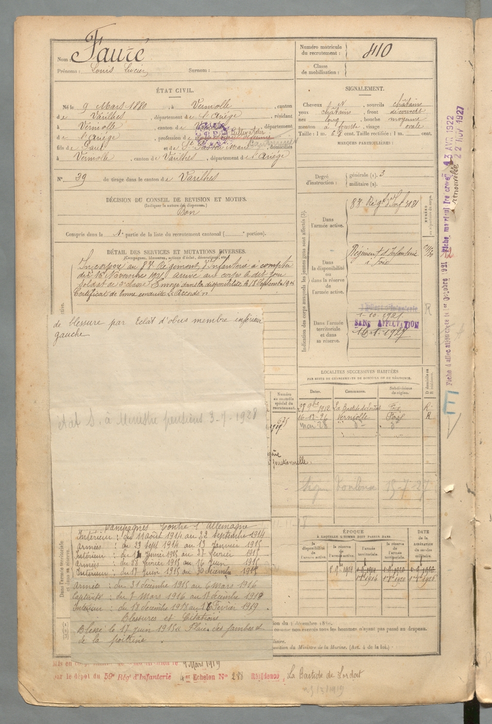 | Fauré | Louis Lucien | FOIX | 129 W 2 | 1900 | Verniolle | Verniolle | 410 |
