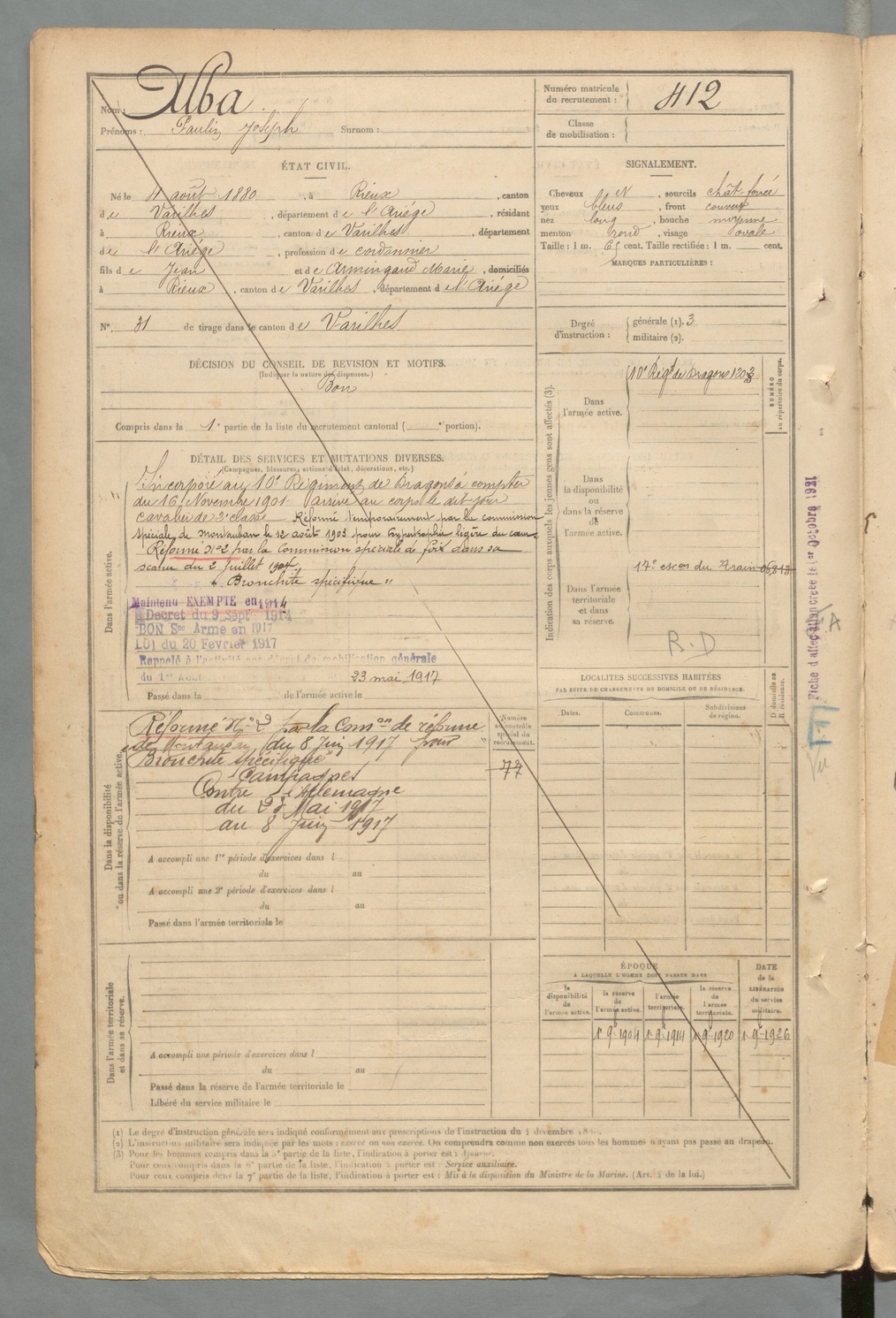 | Alba | Paulin Joseph | FOIX | 129 W 2 | 1900 | Rieux-de-Pelleport | Rieux-de-Pelleport | 412 |
