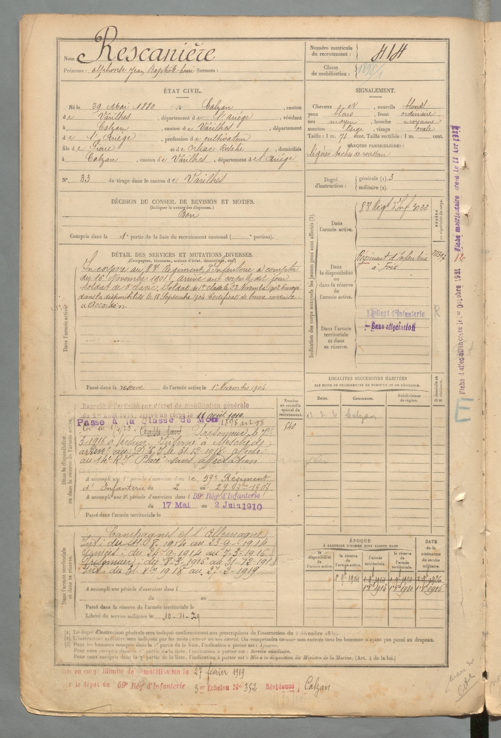 | Rescanière | Alphonse Jean Baptiste Henri | FOIX | 129 W 2 | 1900 | Calzan | Calzan | 414 |