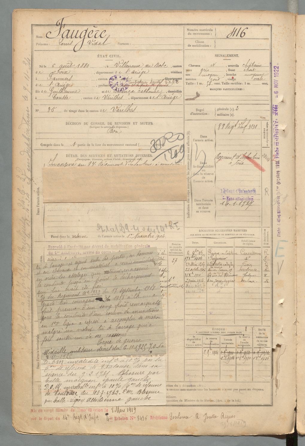 | Faugère | Louis Vidal | FOIX | 129 W 2 | 1900 | Villeneuve-du-Bosc | Pamiers | 416 |