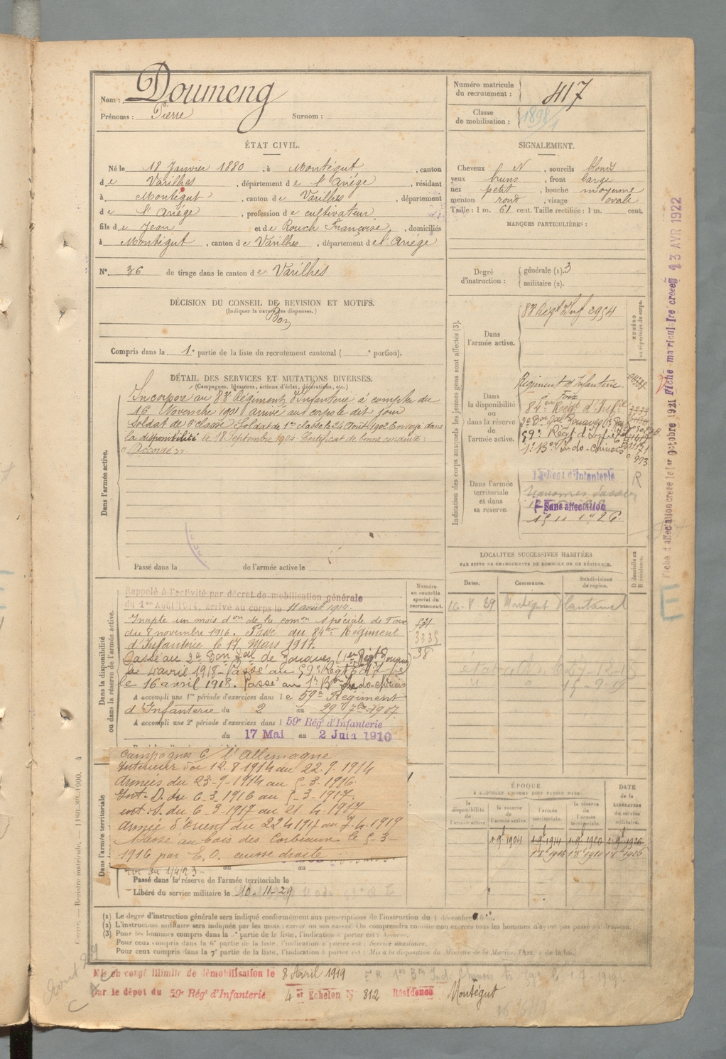 | Doumeng | Pierre | FOIX | 129 W 2 | 1900 | Montégut-Plantaurel | Montégut-Plantaurel | 417 |