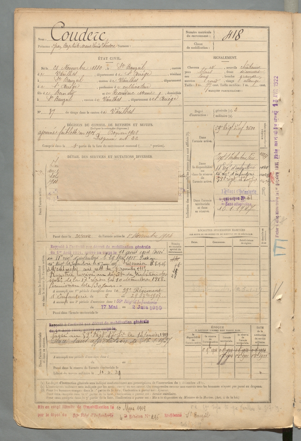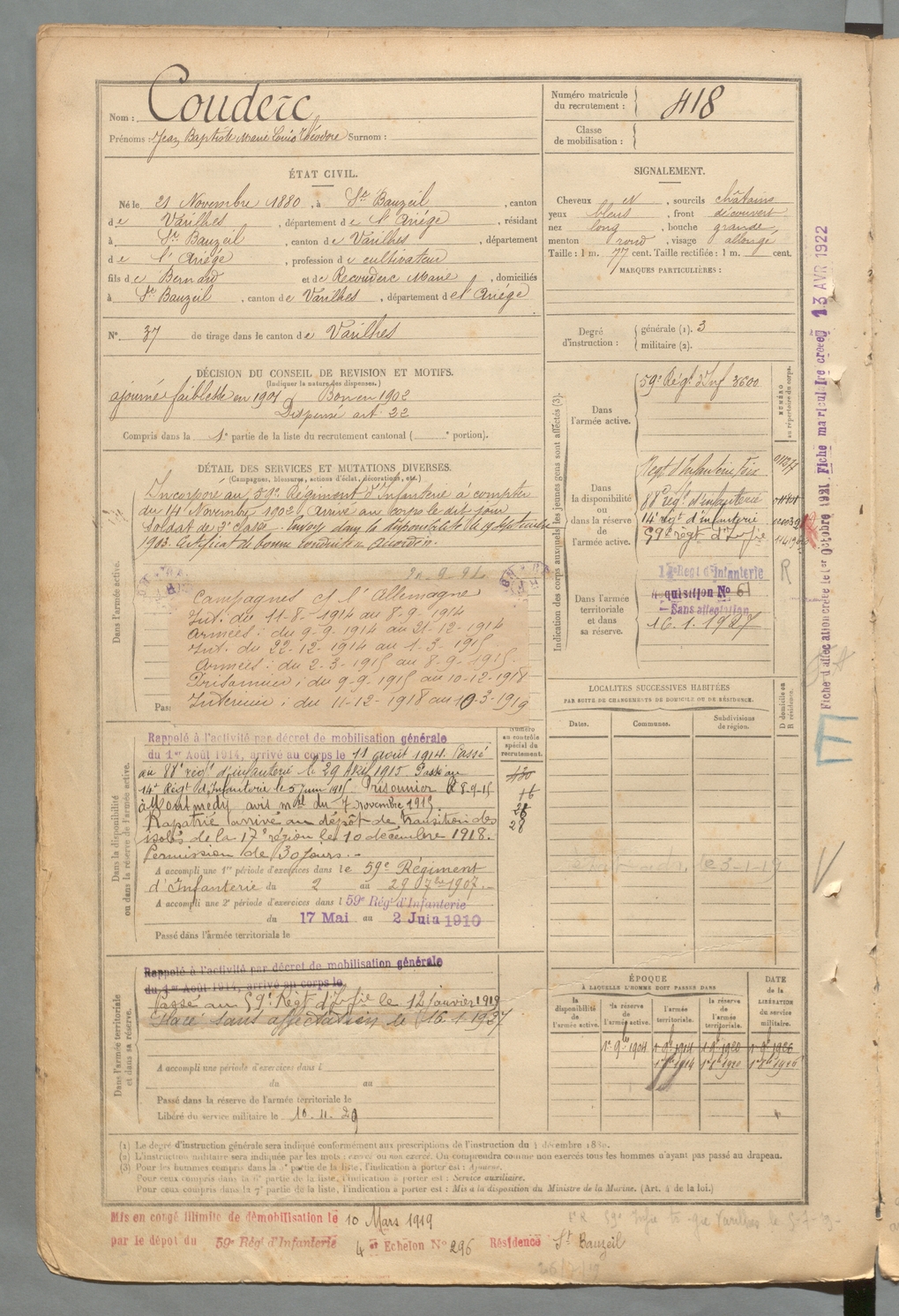| Couderc | Jean Baptiste Marie Louis Théodore | FOIX | 129 W 2 | 1900 | Saint-Bauzeil | Saint-Bauzeil | 418 |