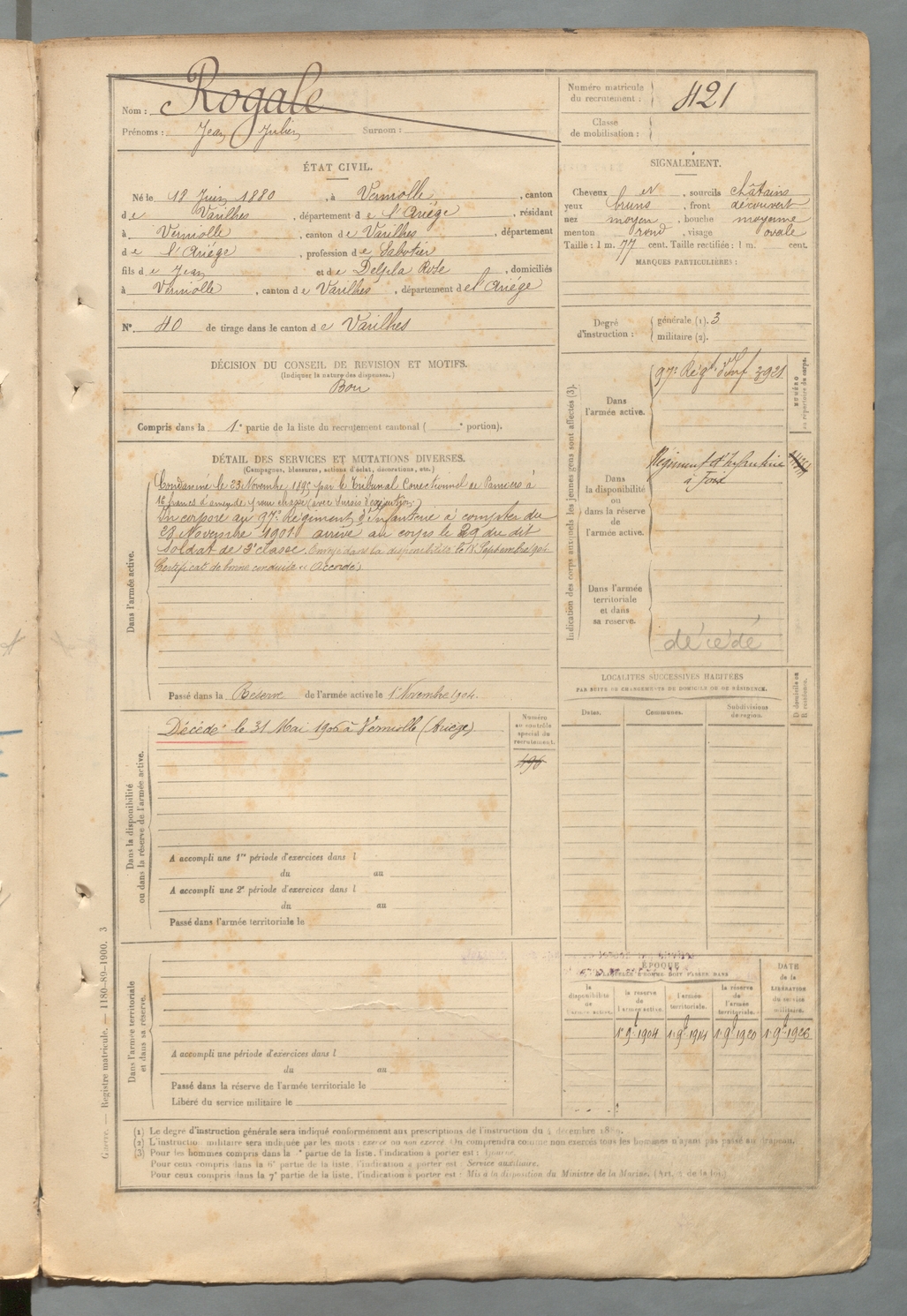 | Rogale | Jean Julien | FOIX | 129 W 2 | 1900 | Verniolle | Verniolle | 421 |