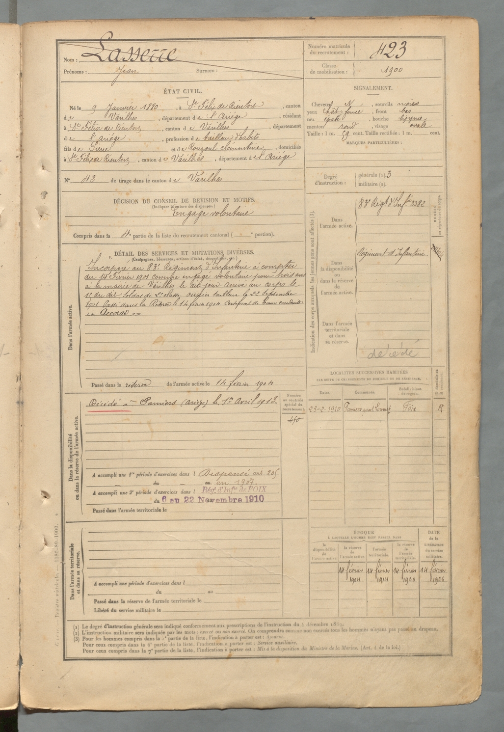 | Lasserre | Jean | FOIX | 129 W 2 | 1900 | Saint-Félix-de-Rieutort | Saint-Félix-de-Rieutort | 423 |