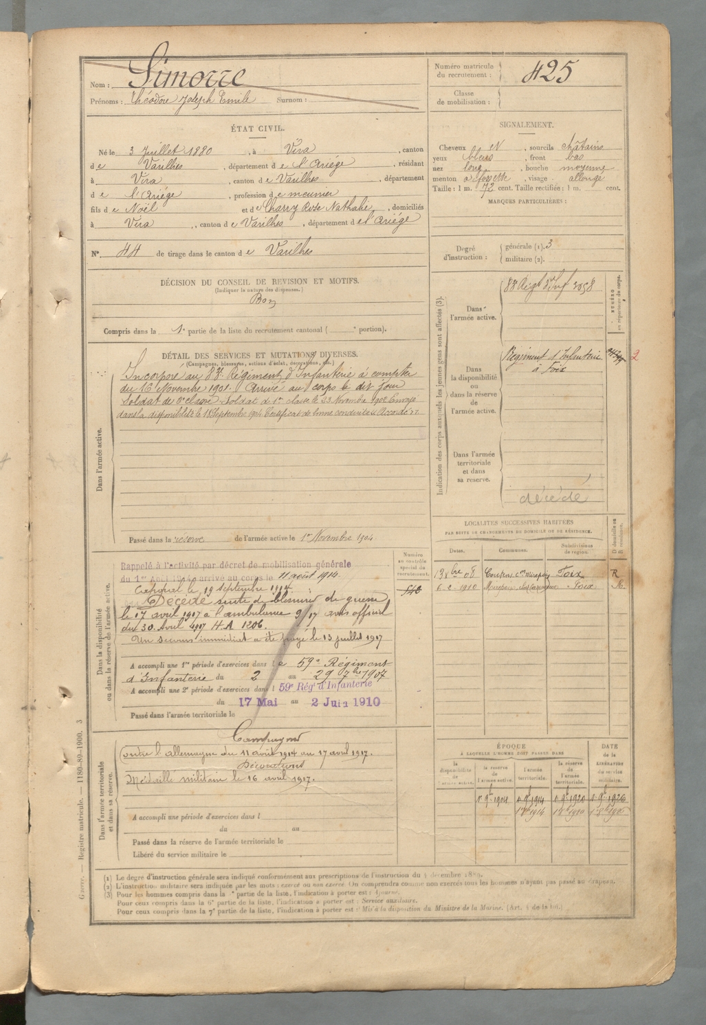| Simorre | Théodore Joseph Emile | FOIX | 129 W 2 | 1900 | Vira | Vira | 425 |