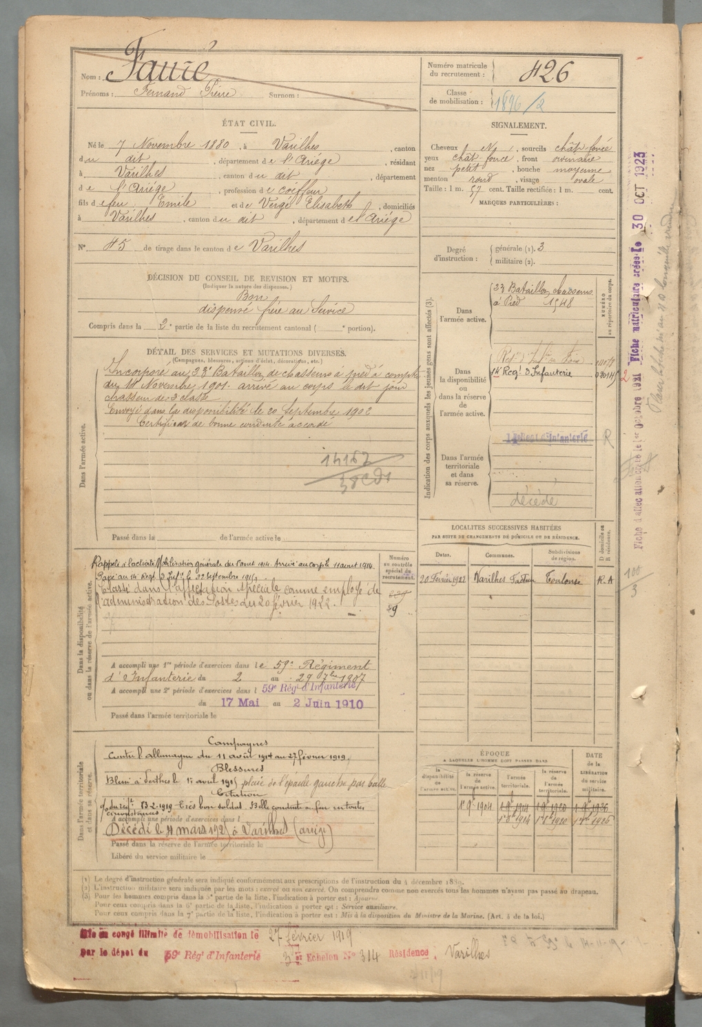 | Fauré | Fernand Pierre | FOIX | 129 W 2 | 1900 | Varilhes | Varilhes | 426 |
