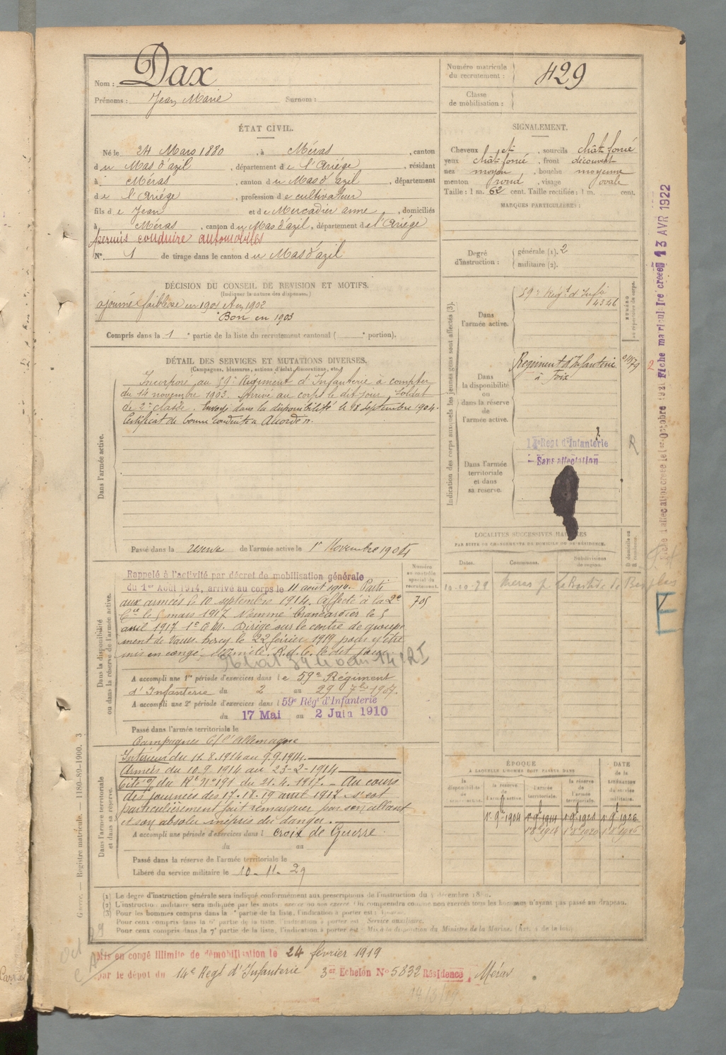 | Dax | Jean Marie | FOIX | 129 W 2 | 1900 | Méras | Méras | 429 |