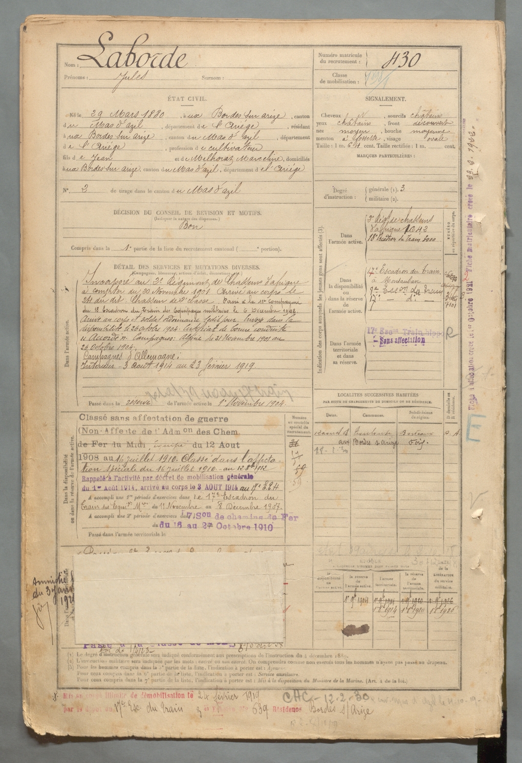 | Laborde | Jules | FOIX | 129 W 2 | 1900 | Bordes-sur-Arize (Les) | Bordes-sur-Arize (Les) | 430 |