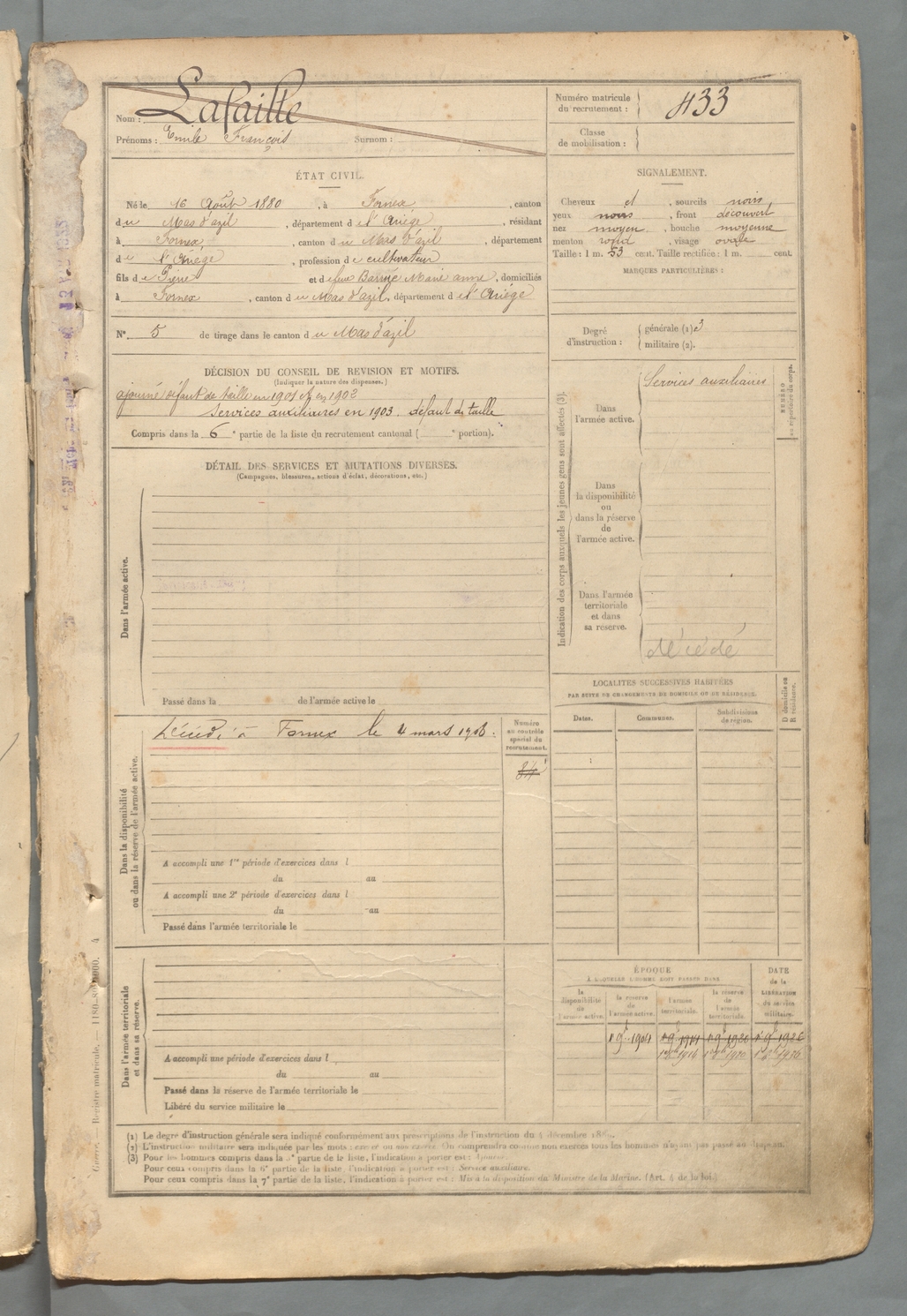 | Lafaille | Emile François | FOIX | 129 W 2 | 1900 | Fornex | Fornex | 433 |