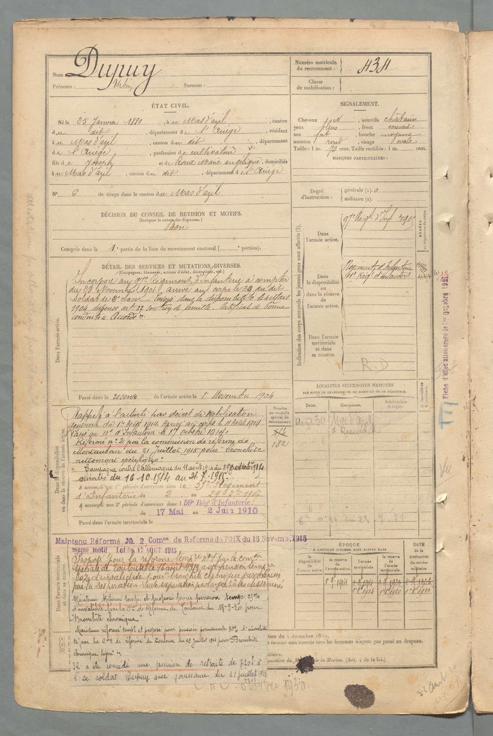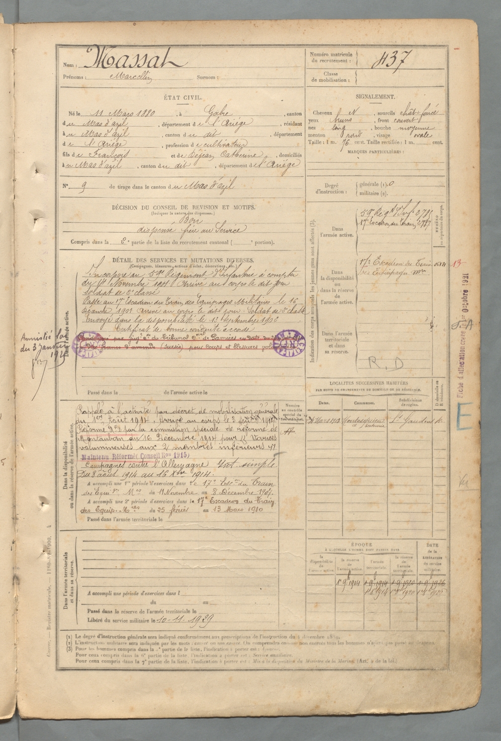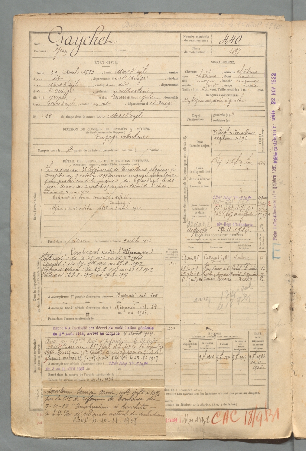 | Gaychet | Jean | FOIX | 129 W 2 | 1900 | Mas-d'Azil (Le) | Mas-d'Azil (Le) | 440 |