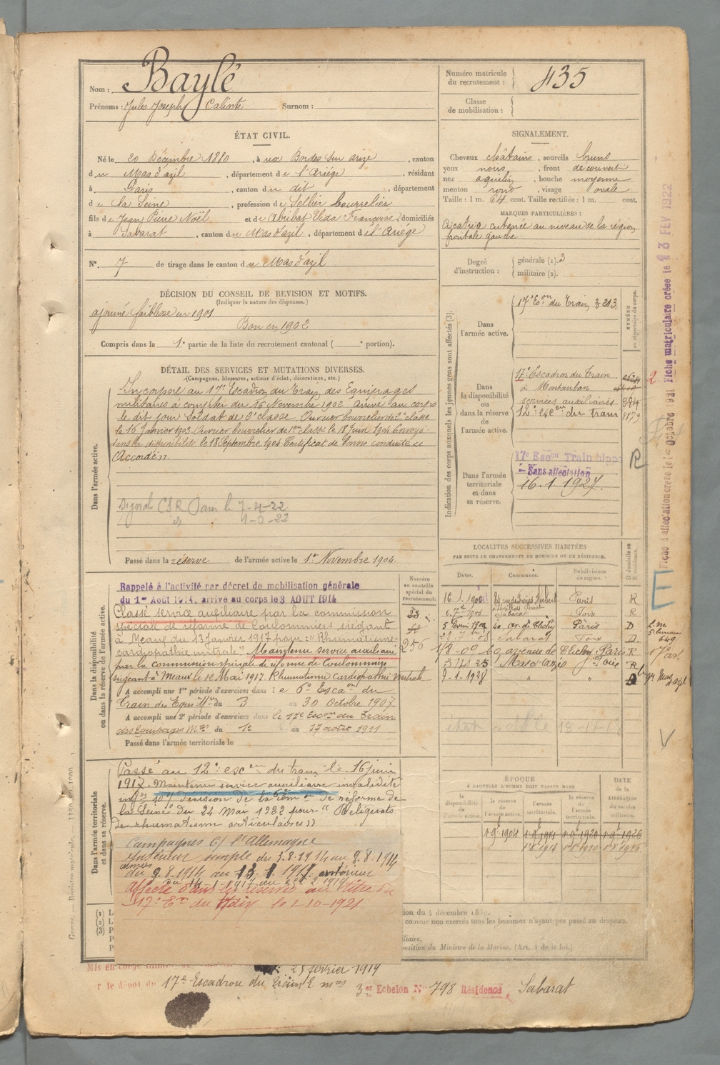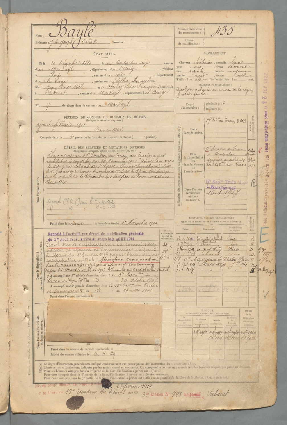 | Baylé | Jules Joseph Calixte | FOIX | 129 W 2 | 1900 | Bordes-sur-Arize (Les) | Paris | 435 |