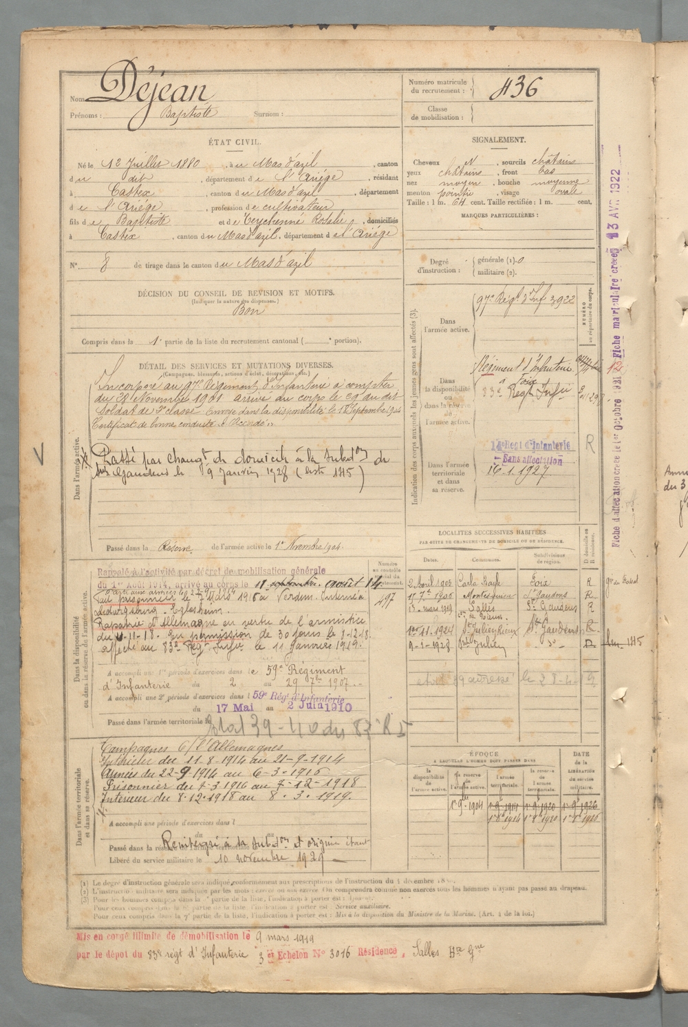 | Déjean | Baptiste | FOIX | 129 W 2 | 1900 | Mas-d'Azil (Le) | Castex | 436 |