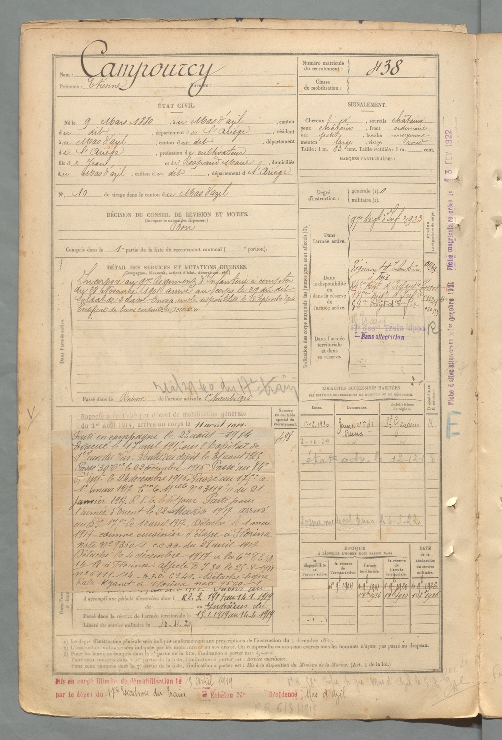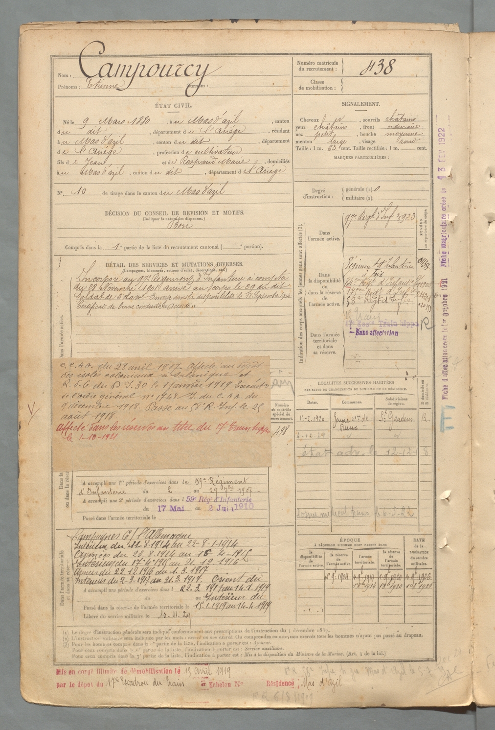 | Camourcy | Etienne | FOIX | 129 W 2 | 1900 | Mas-d'Azil (Le) | Mas-d'Azil (Le) | 438 |