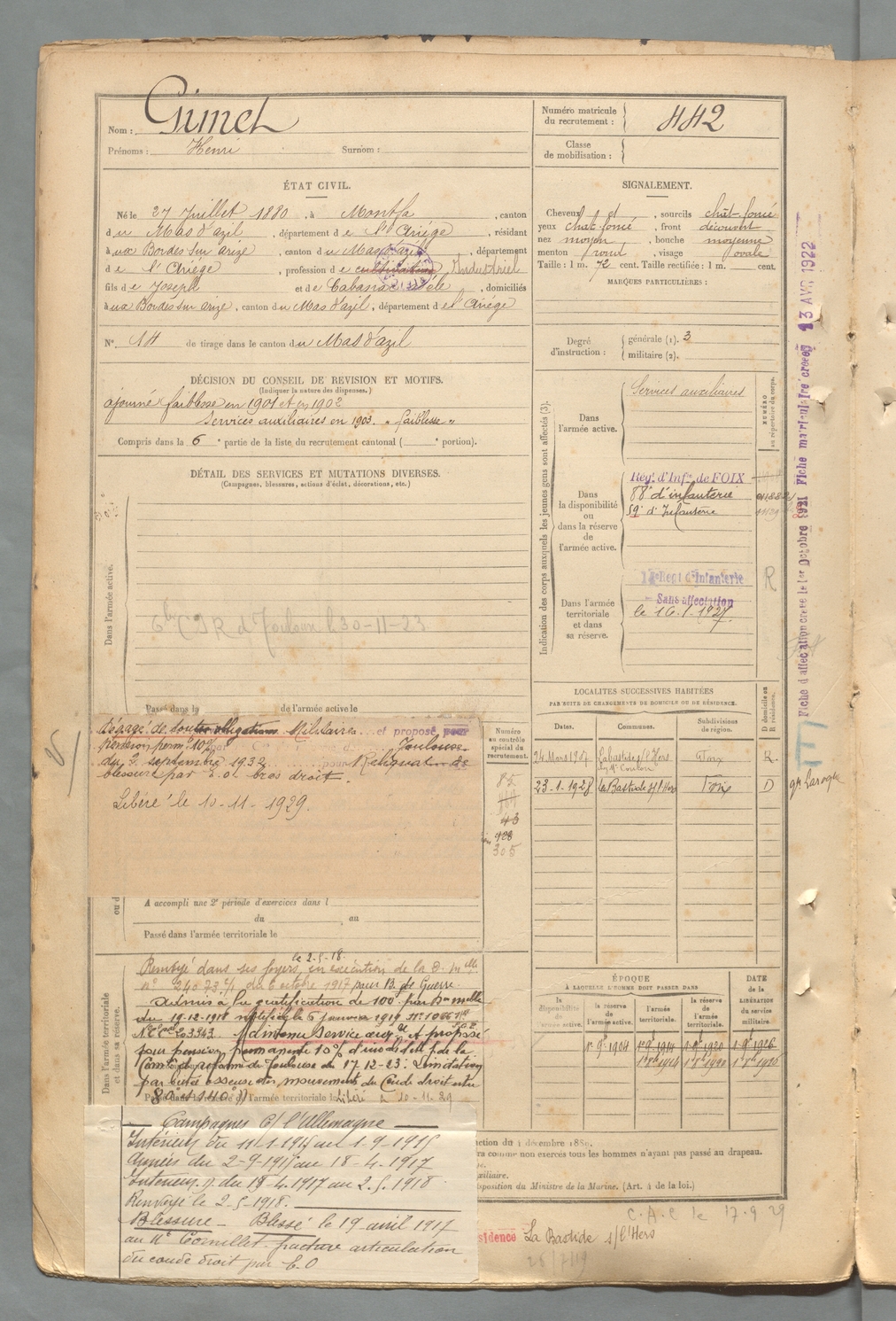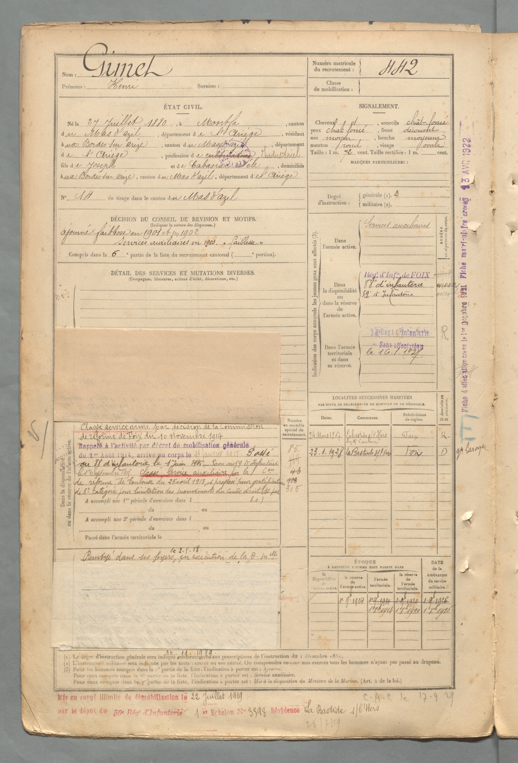 | Gimet | Henri | FOIX | 129 W 2 | 1900 | Montfa | Bordes-sur-Arize (Les) | 442 |