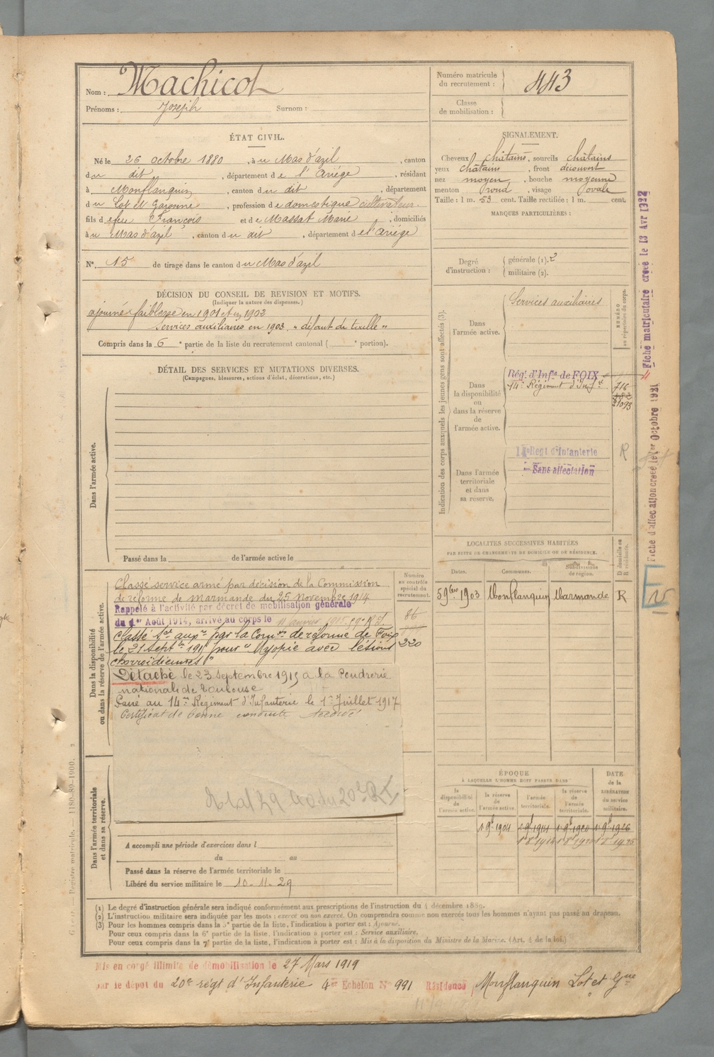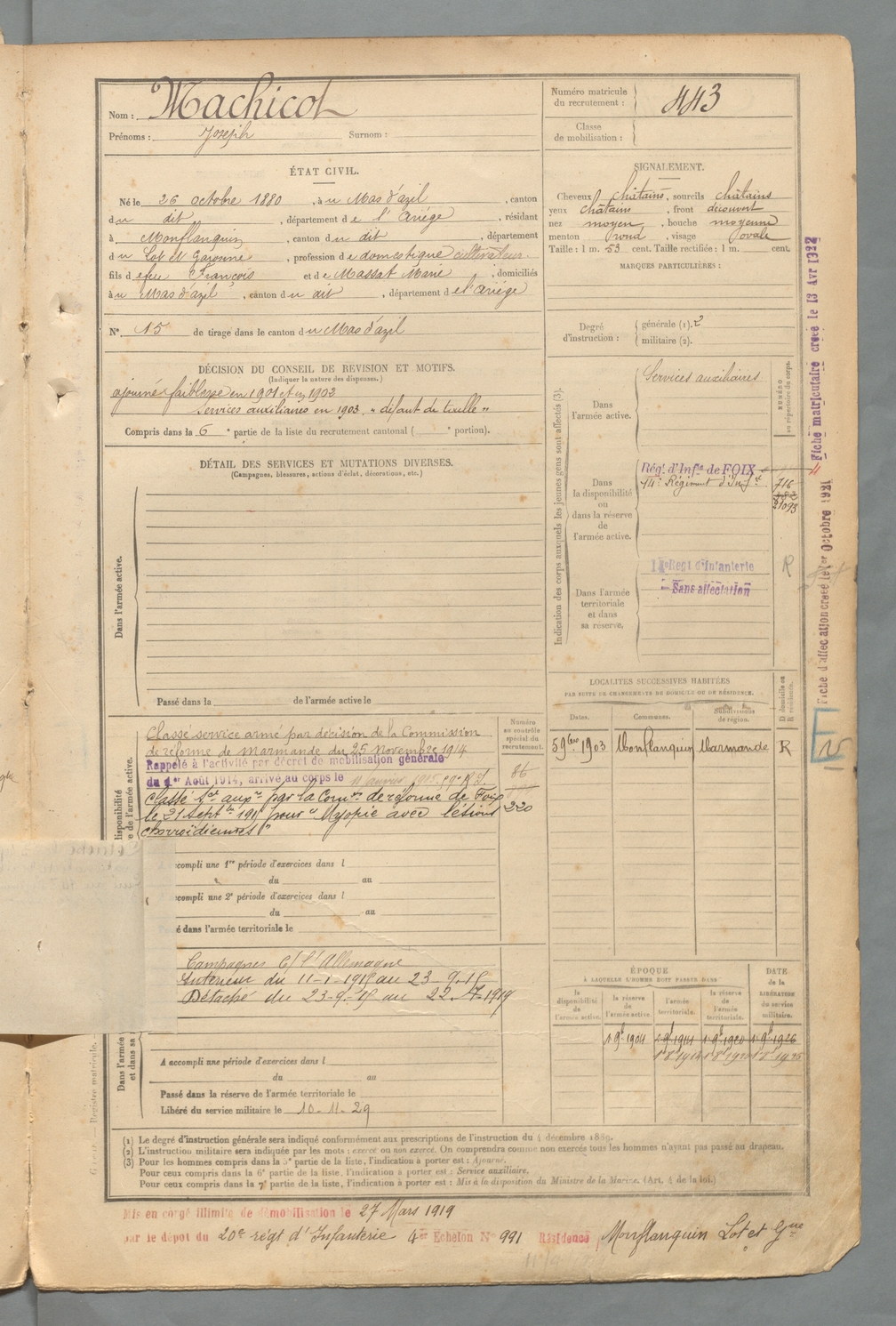 | Machicot | Joseph | FOIX | 129 W 2 | 1900 | Mas-d'Azil (Le) | Monflanquin | 443 |