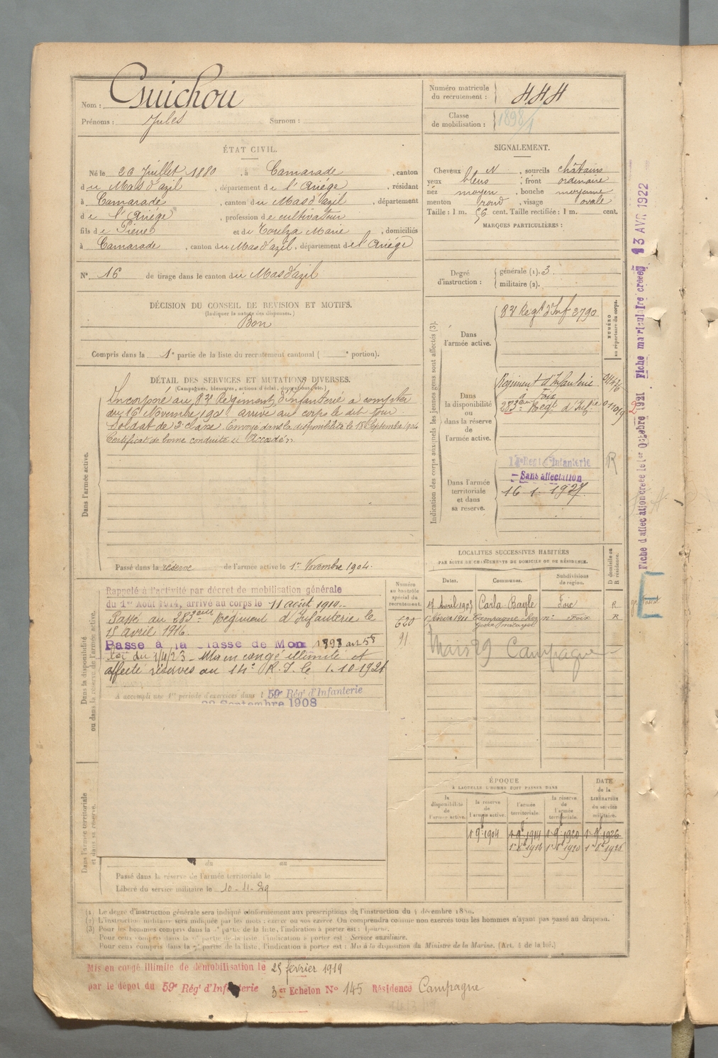 | Guichou | Jules | FOIX | 129 W 2 | 1900 | Camarade | Camarade | 444 |
